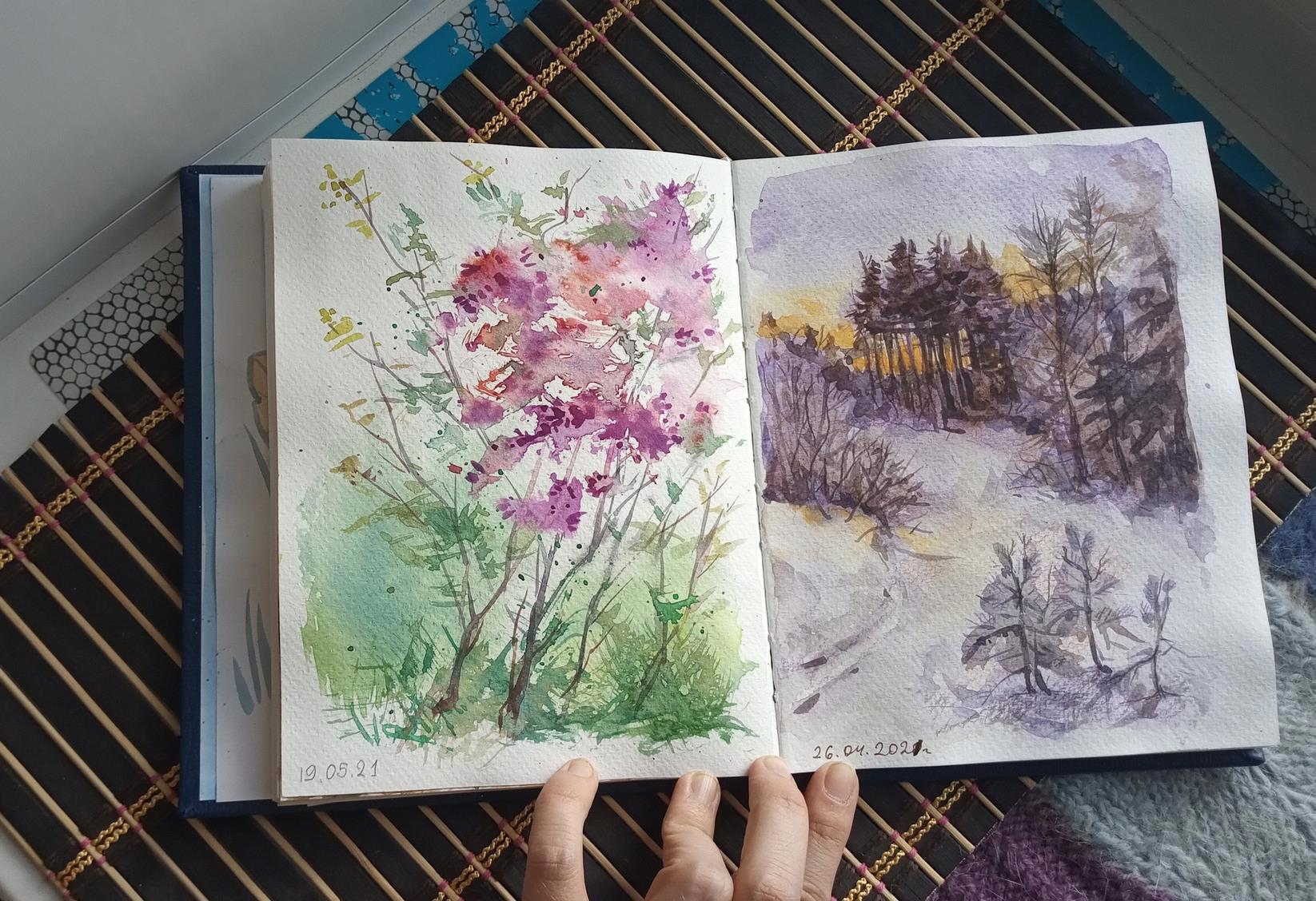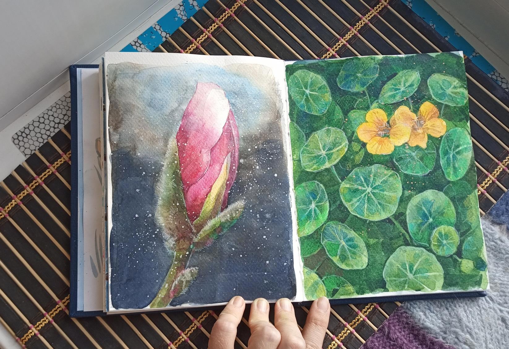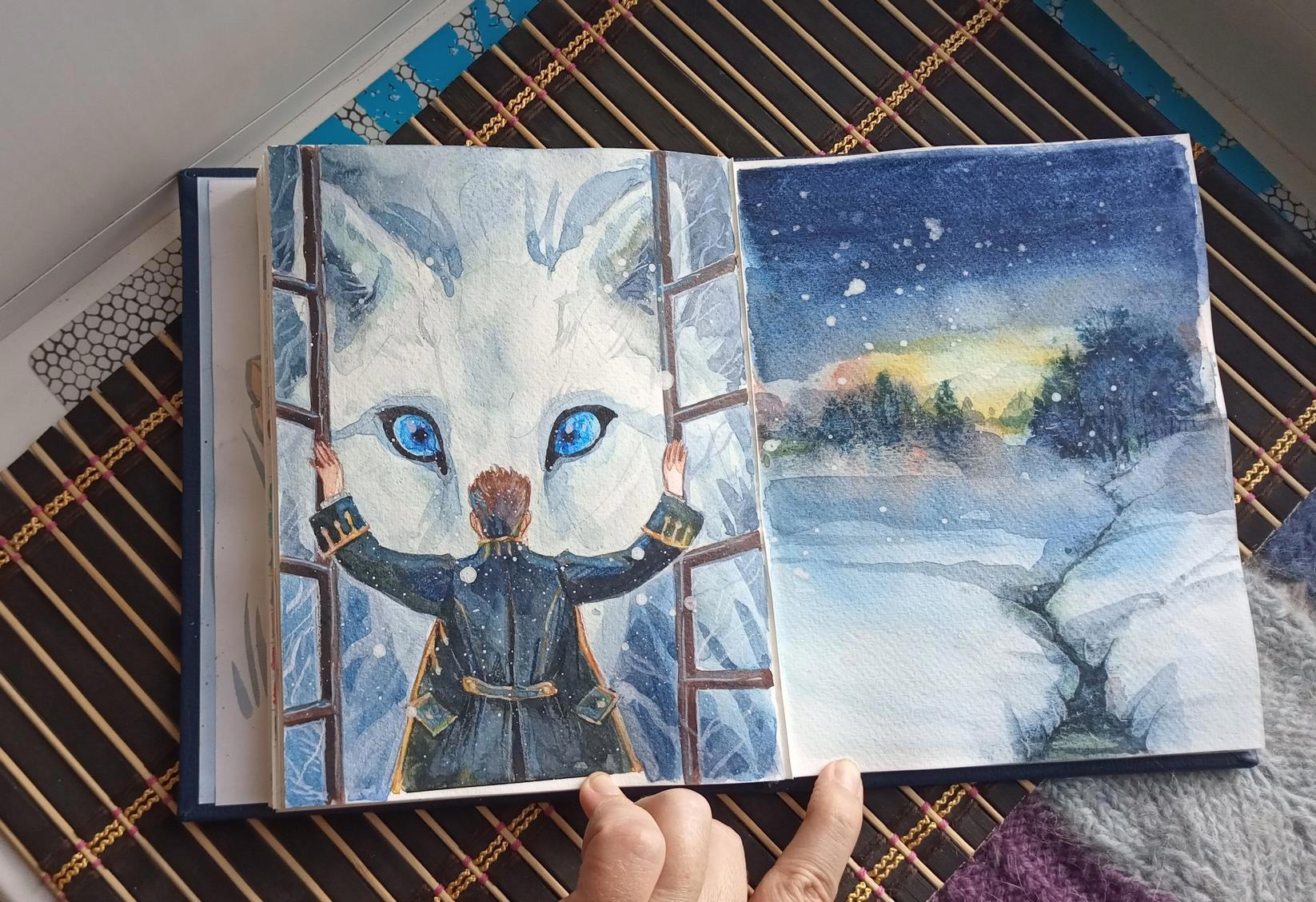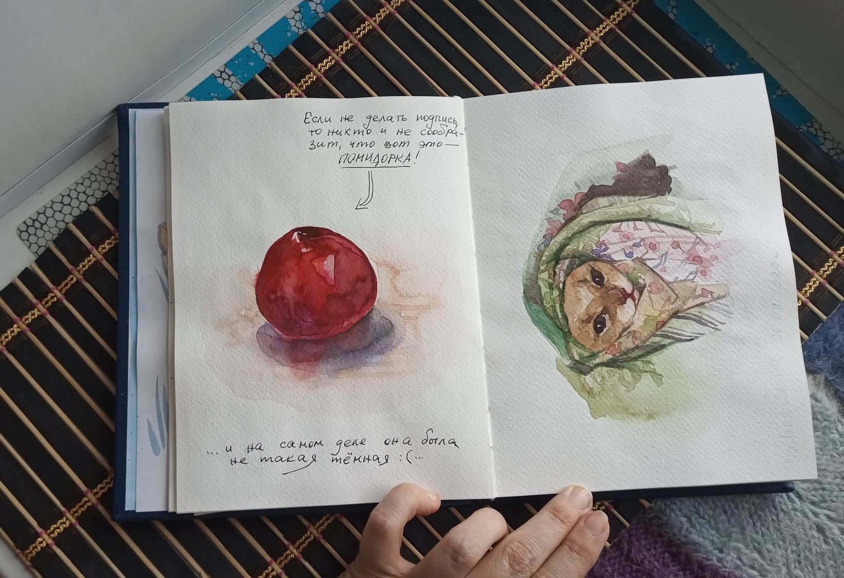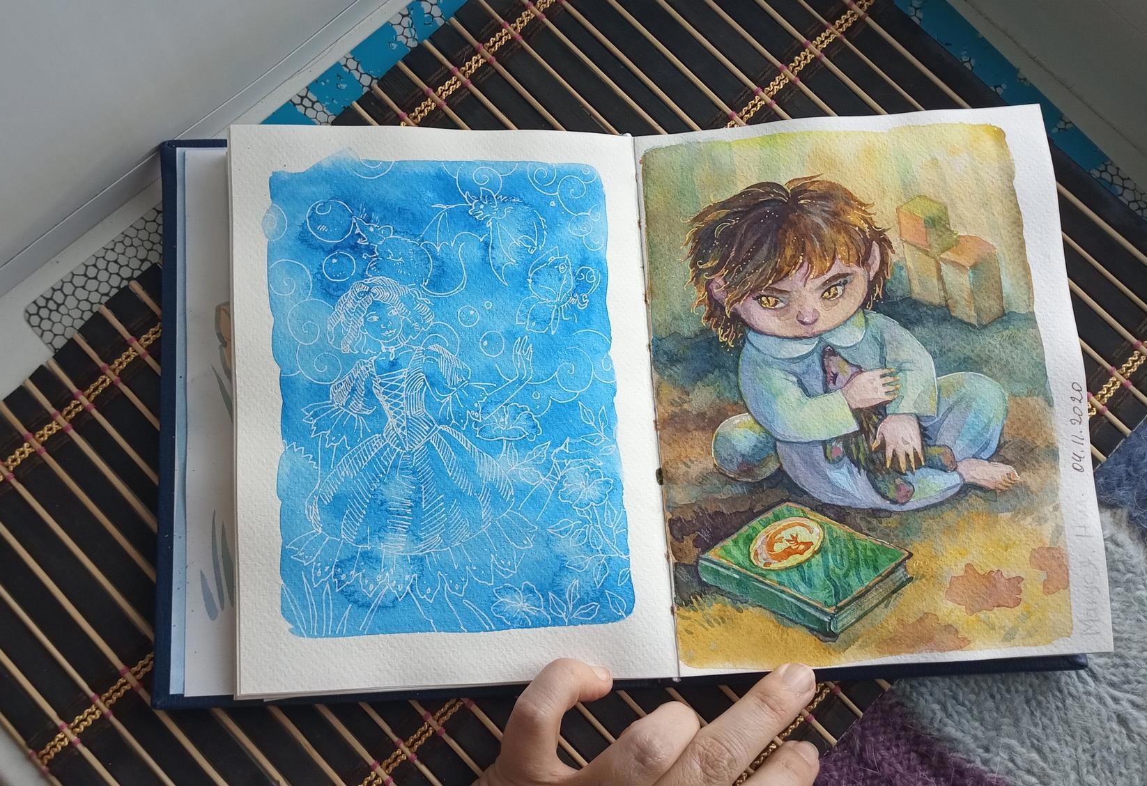 Тут попробовала порисовать на развороте. Не понравилось - сгиб всё портит.