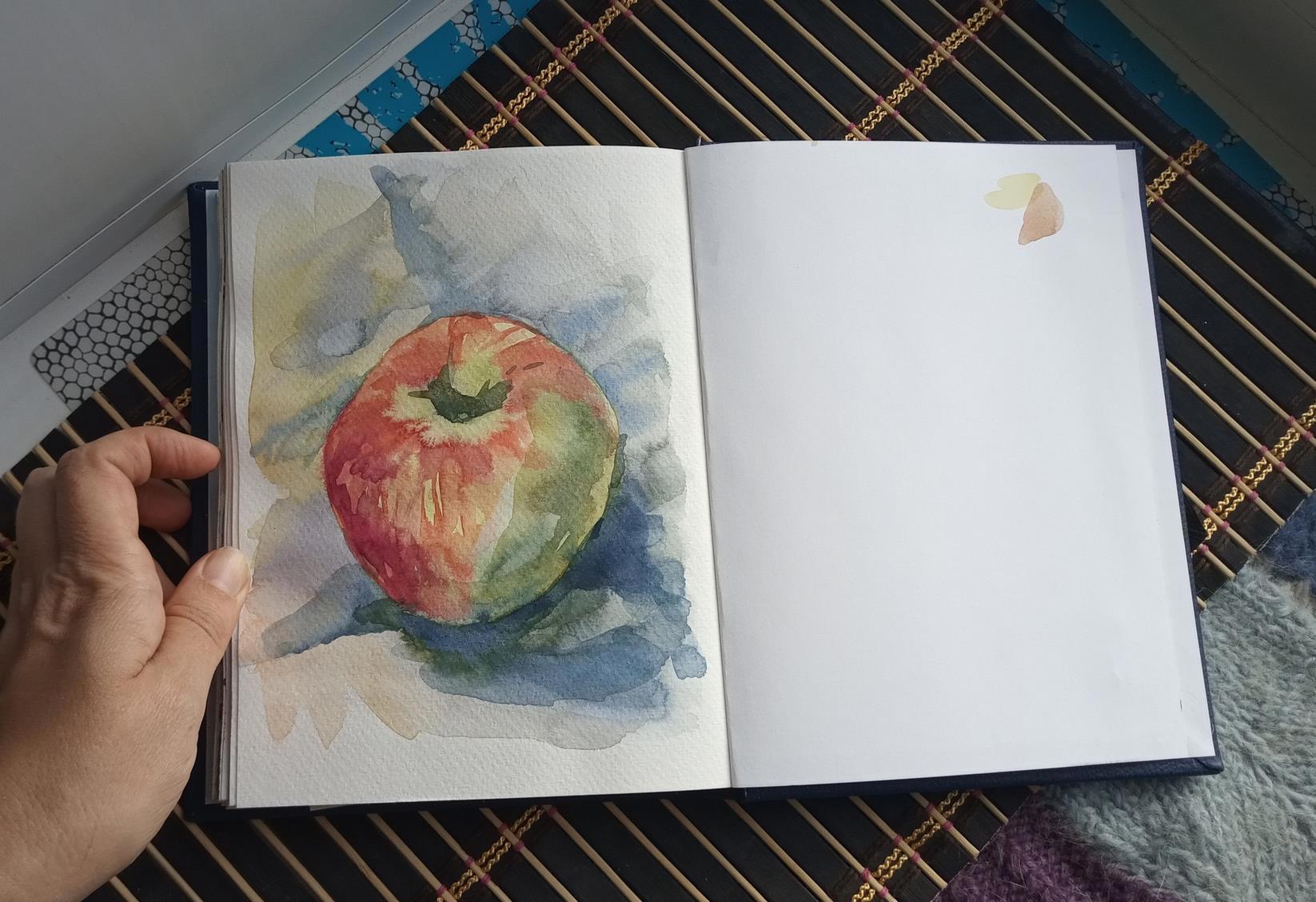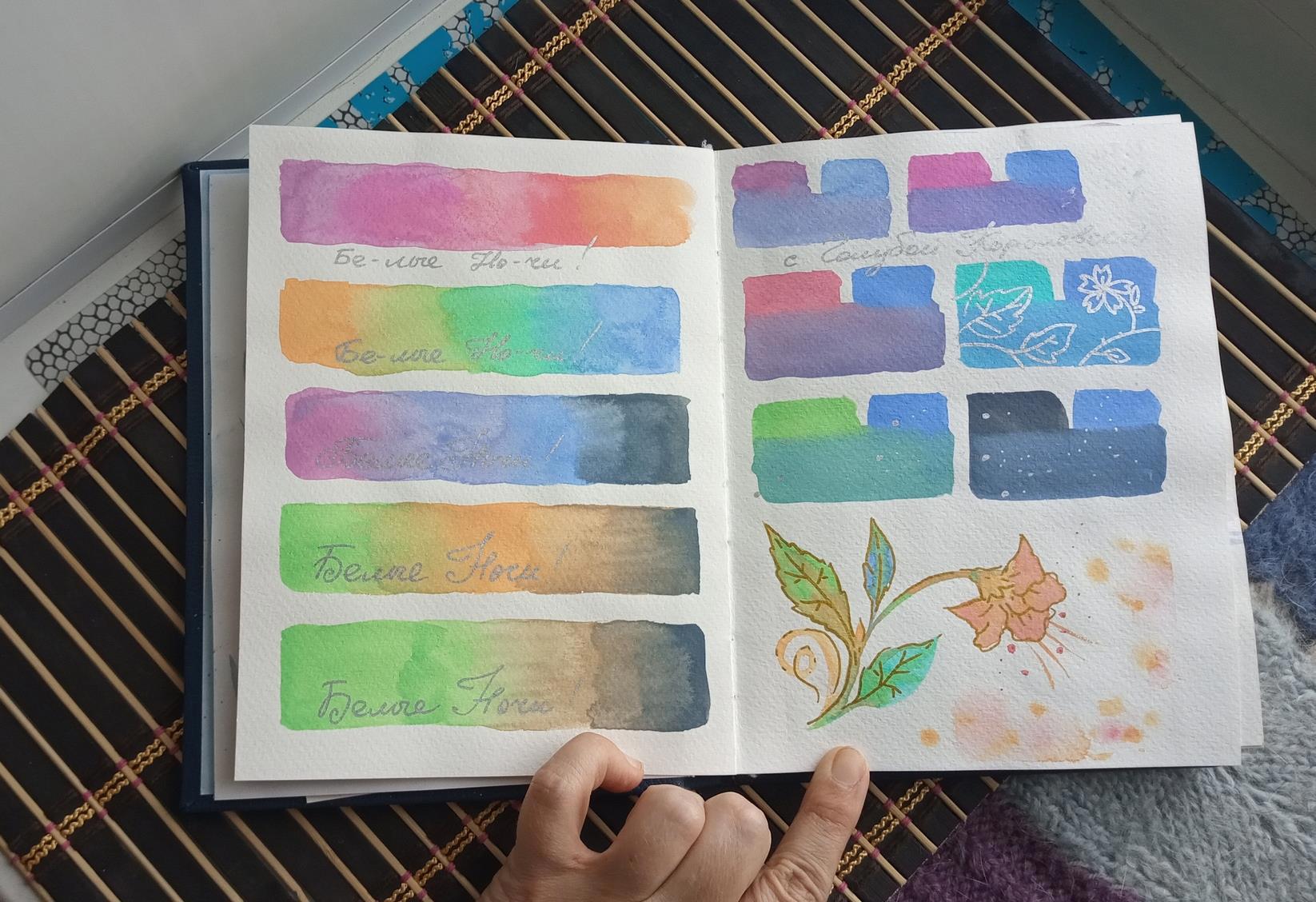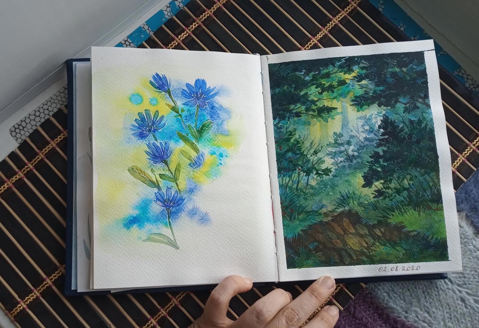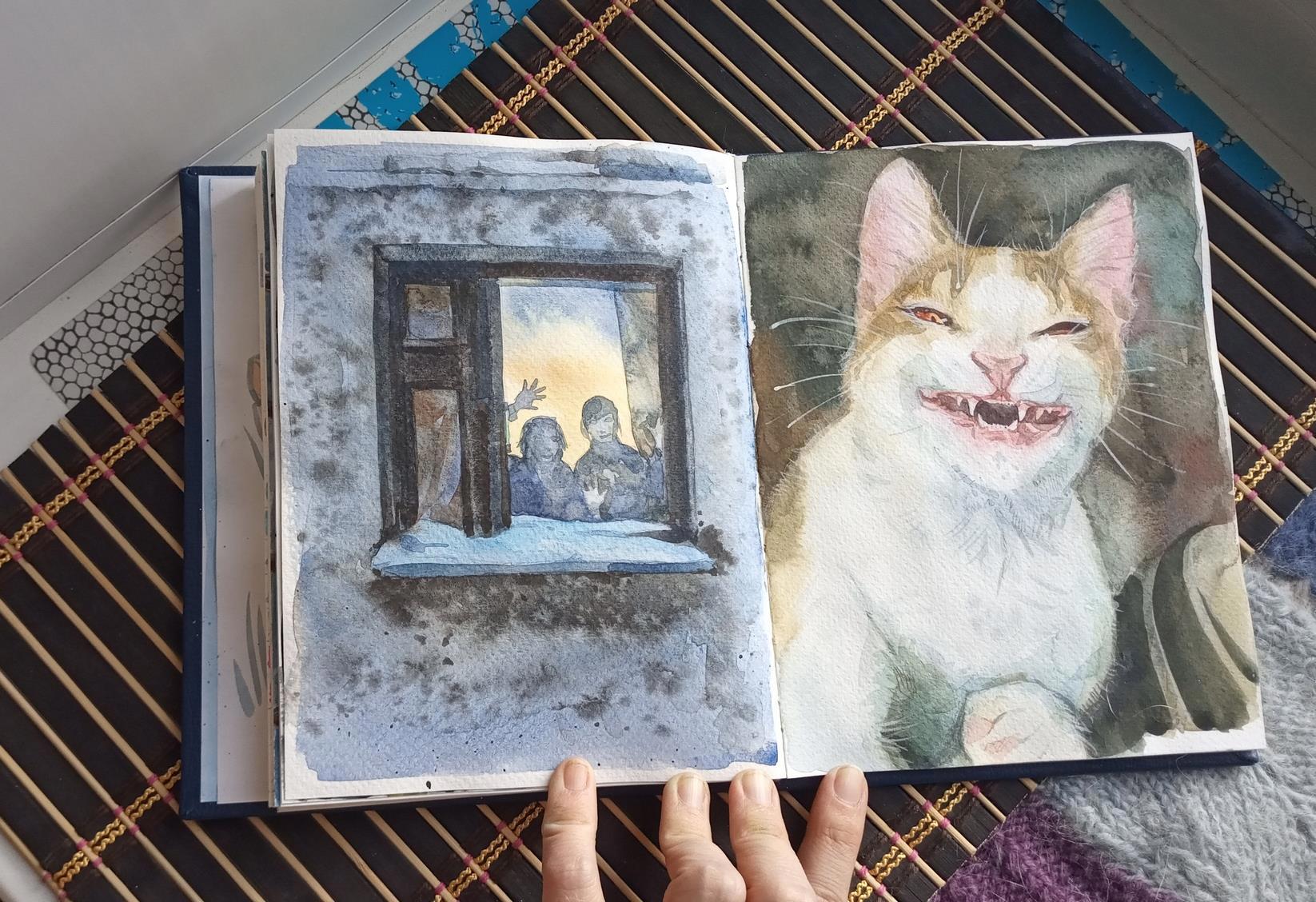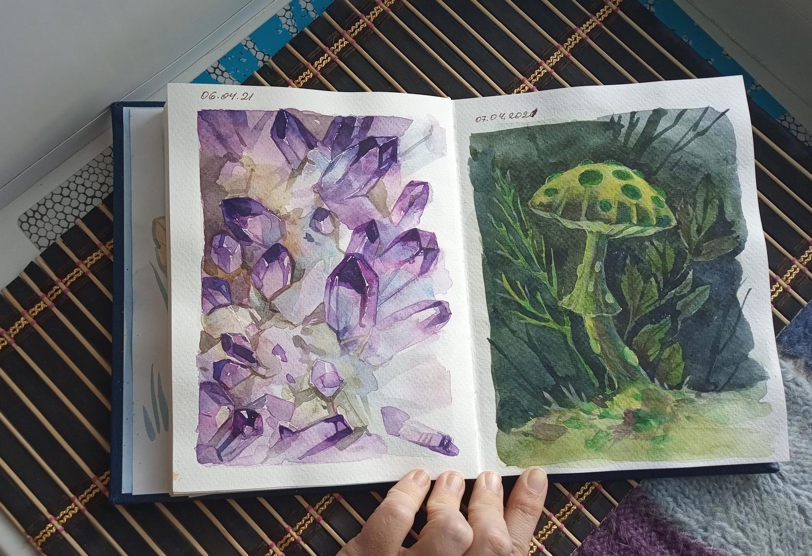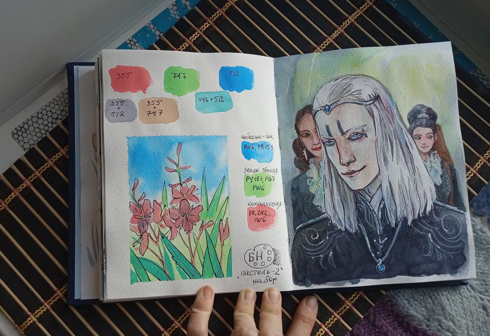 Тут попробовала порисовать на развороте. Не понравилось - сгиб всё портит.