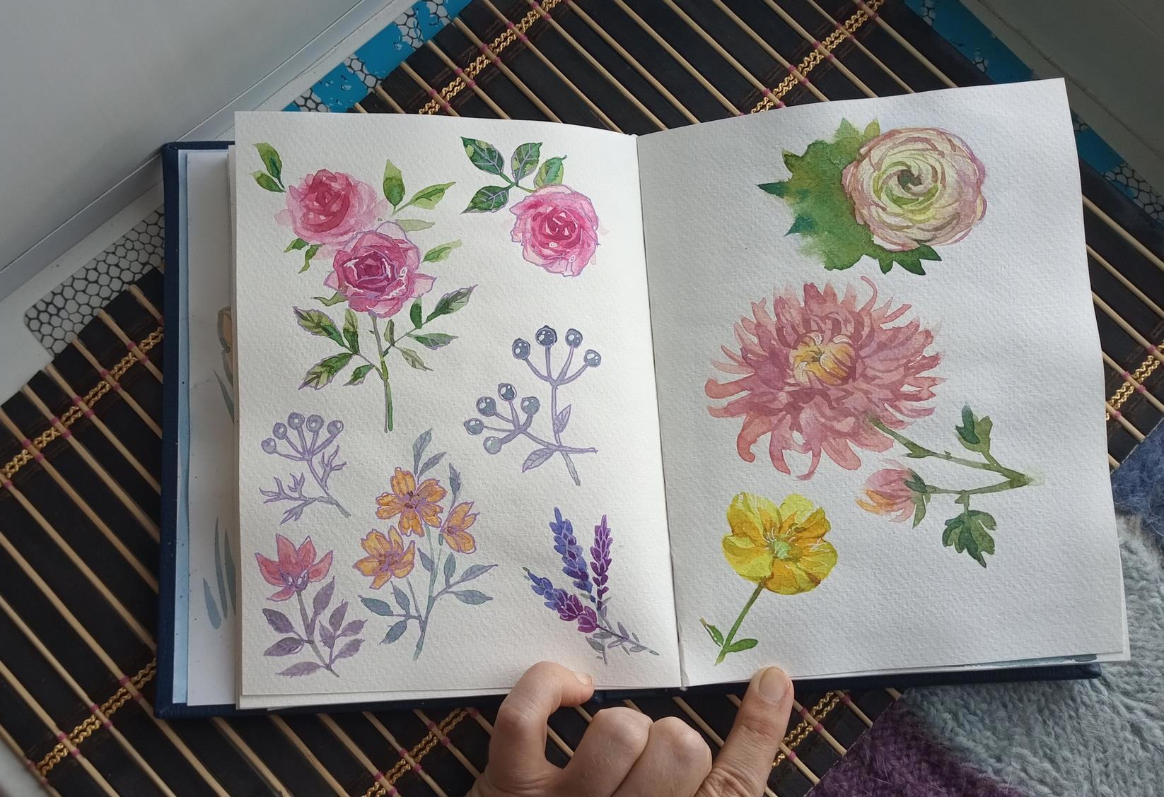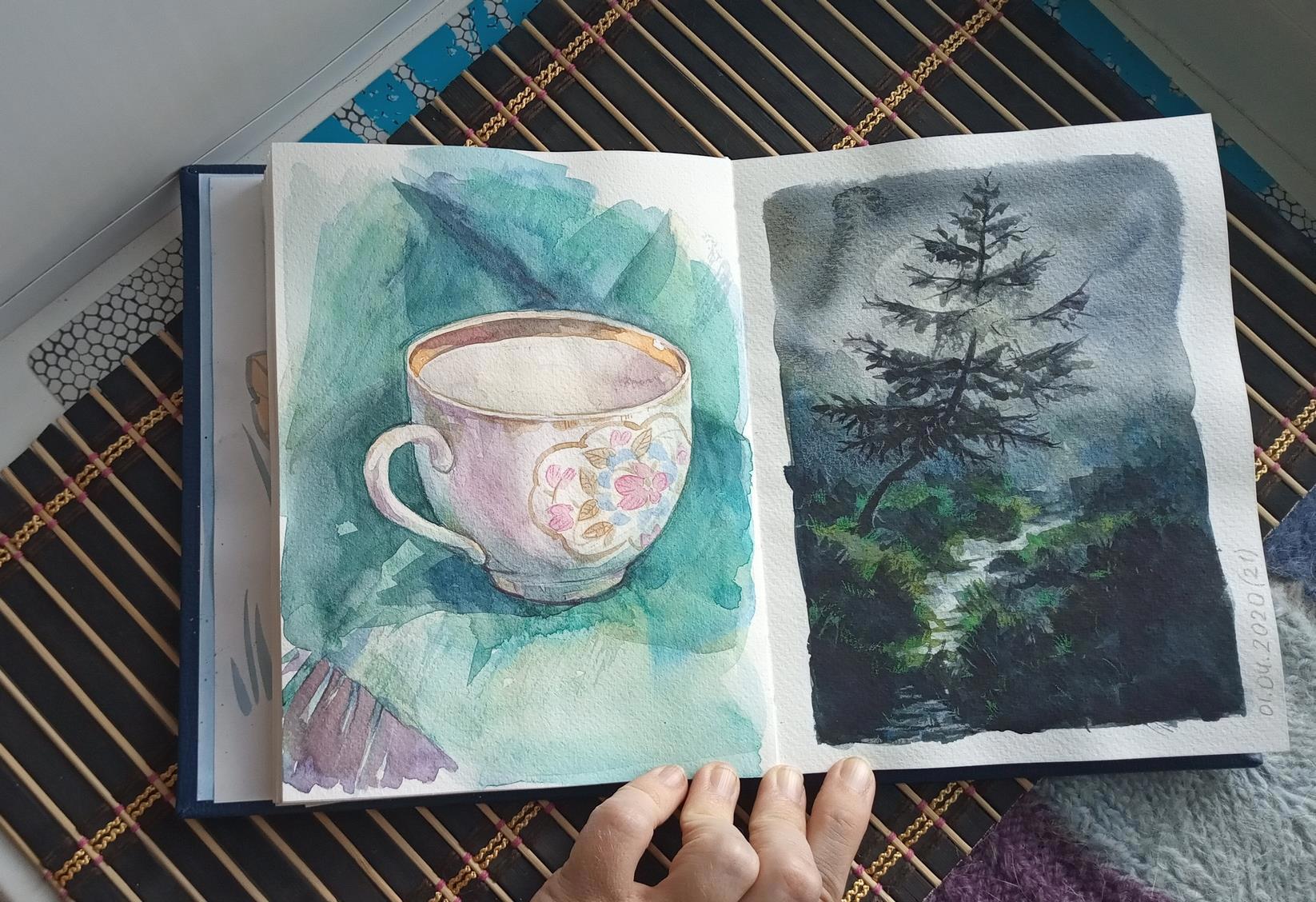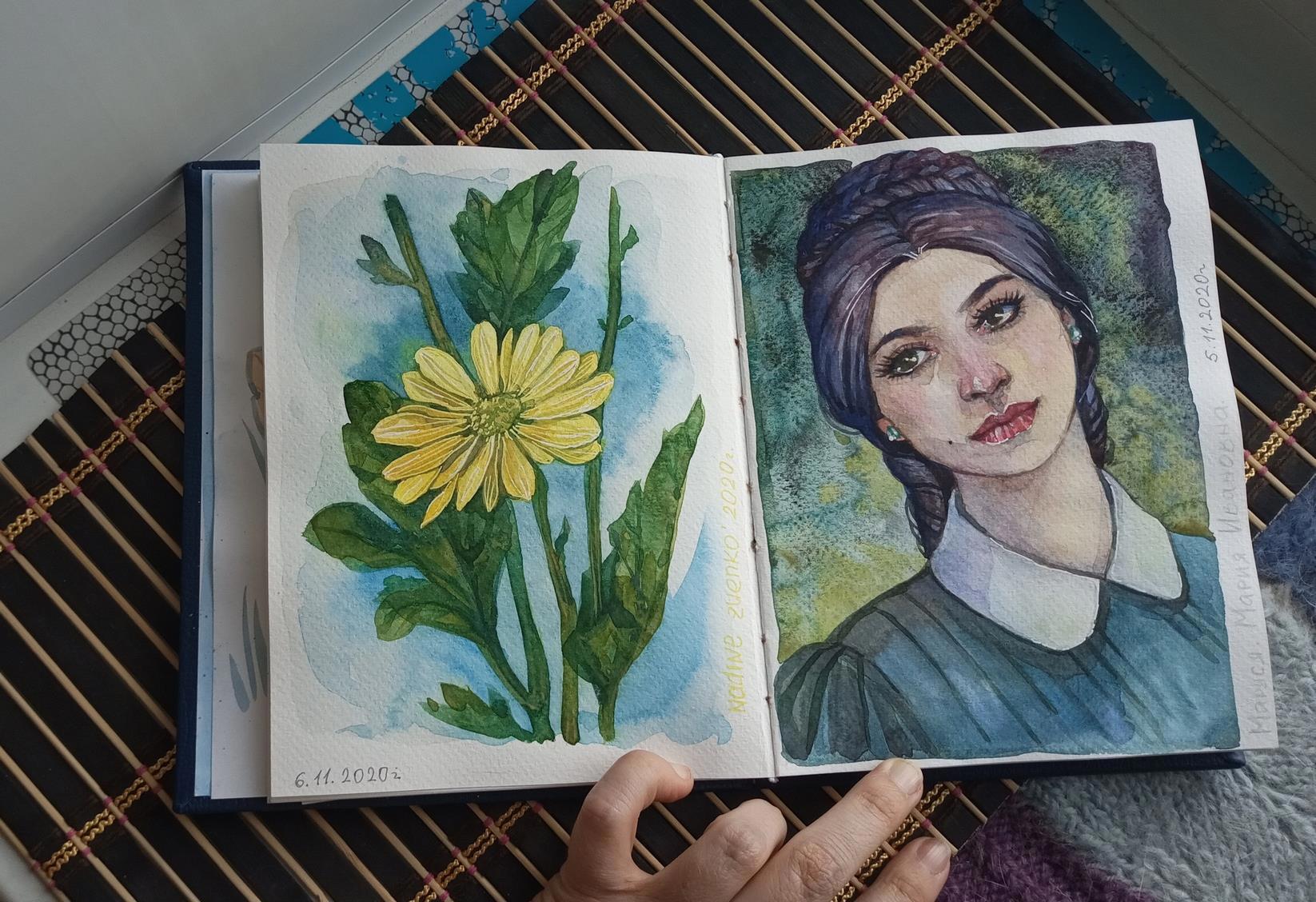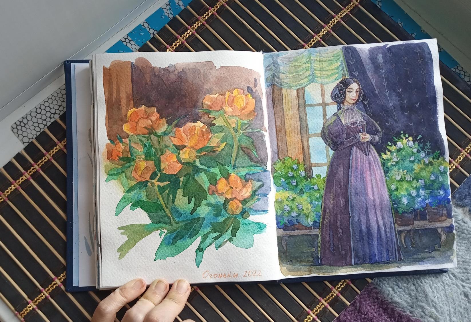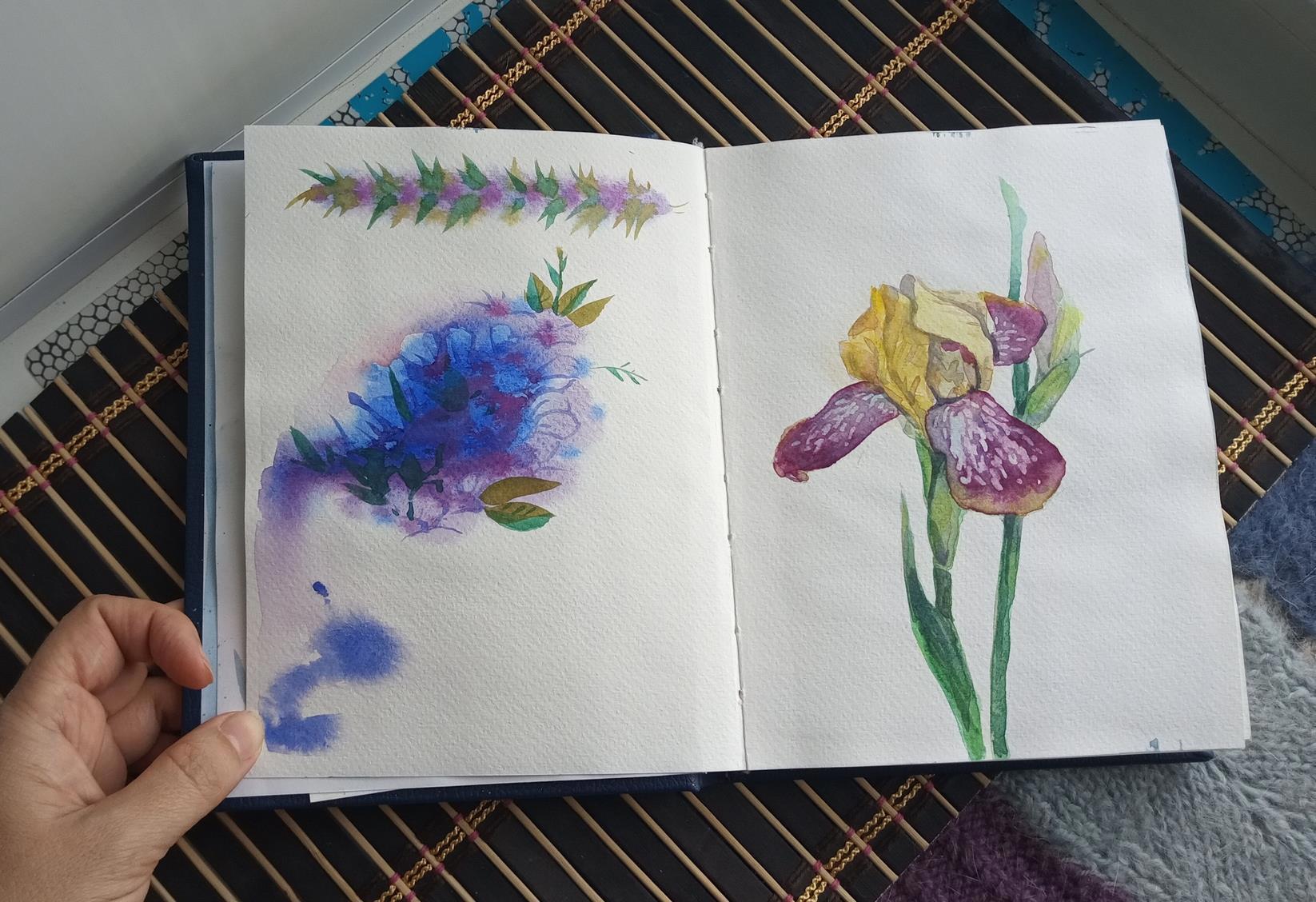 Тут попробовала порисовать на развороте. Не понравилось - сгиб всё портит.