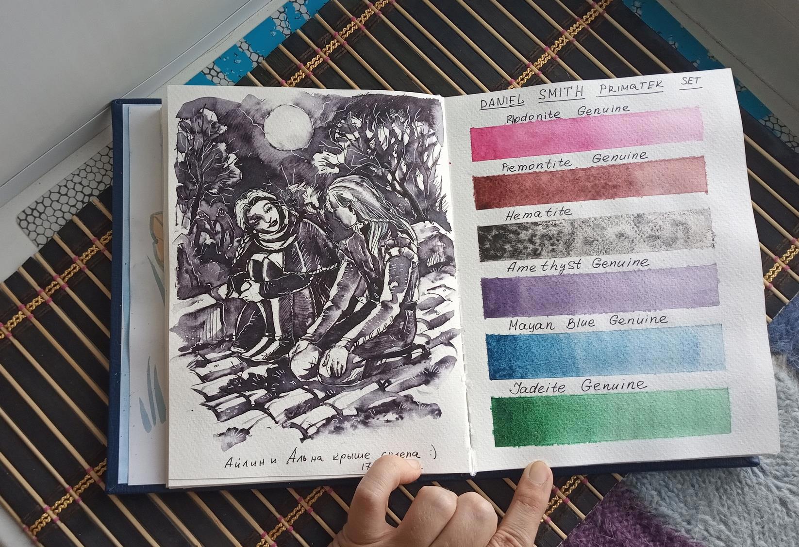 Тут вот картинка к "Королеве Теней" (сценка знакомства Айлин с Аластором на кладбище) перьевой ручкой Кавеко (хорошая ручка. А приноровиться размывать как надо можно). А с другой стороны - выкраска Даниель Смит Приматек. Типа, минеральная серия, с натуральными камешками. И, признаться, оно мне не понравилось. Серый осадок всё грязнит, для живописи или попыток в нее никак. Так что... лежит. Почти не юзается.