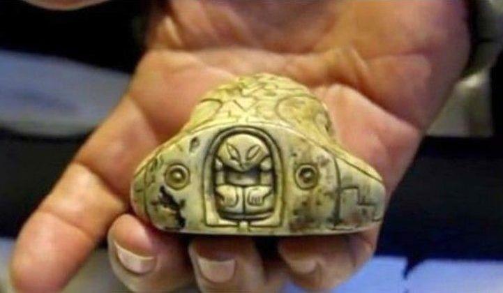 Ну, да, посмотрев на эти картинки, современный человек вот в этом изображении легко «узнает» пришельца, выглядывающего из летающей тарелки. Однако, если несколько отвлечься от стереотипов, то мы увидим там… ну, не знаю… чукчу, сидящего возле раскрашенной кибитки несколько необычной формы. Что в этом такого космического-то? Сами посмотрите: