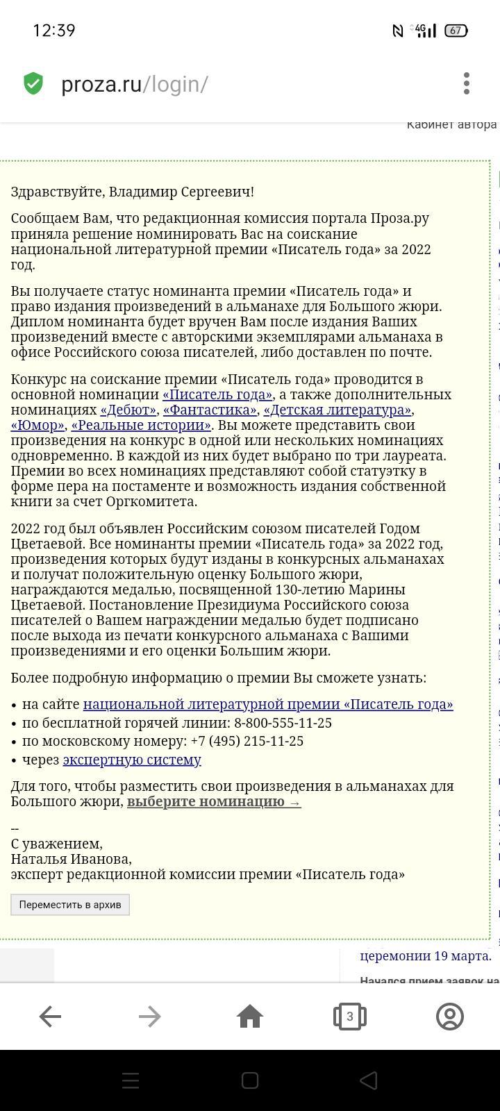 Вы не поверите... Я подал заявку на участие в конкурсе "Писатель года" и... Меня включили в число номинантов! А это гарантированный диплом и печать моей работы в альманахе, совместно с другими участниками!