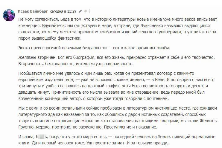 Мне стыдно за вас, стыдно за то, что вы прикрываетесь своим пониженным социально-интеллектуальным статусом, чтобы безнаказанно восторгаться вторичностью. Вы готовы защищать никчёмность потребляемой литературы, лишь бы не признавать то, что я прав: вы читаете очень плохие книжки. И плохие не в таком плане: