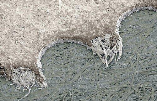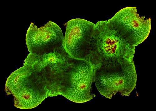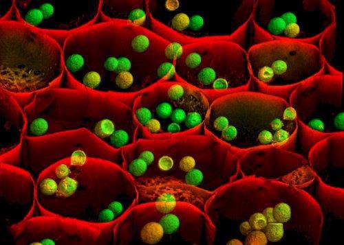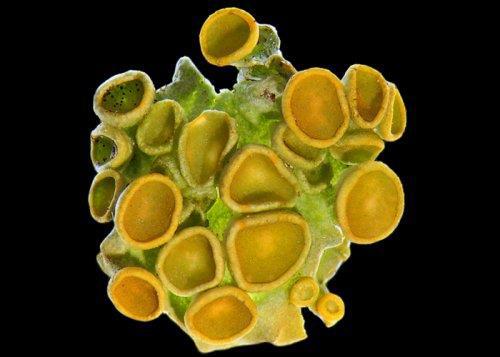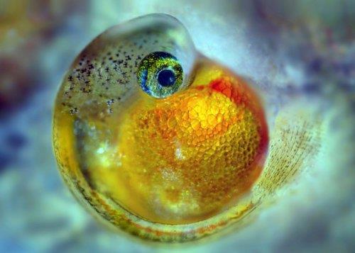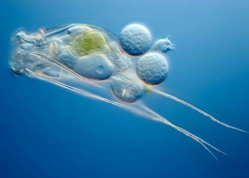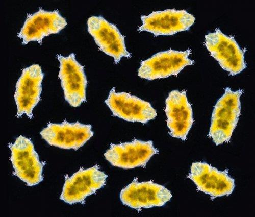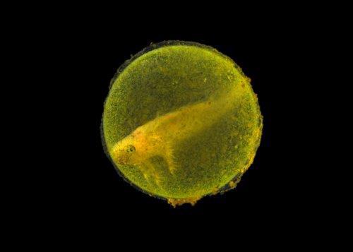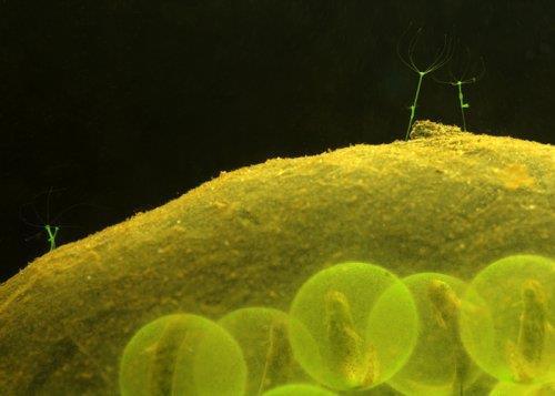 Гидры закрепились на густой пленке, которая укрывает икринки саламандры.