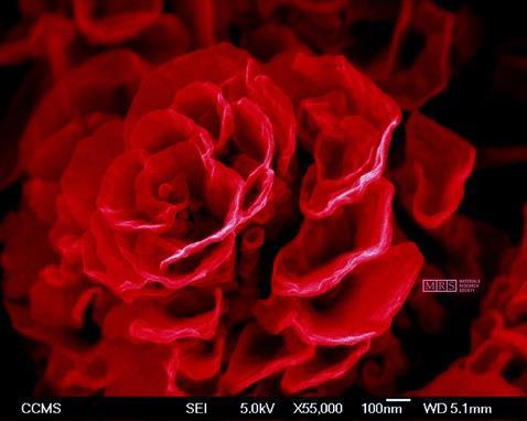 "Розы". Нитрид индия, синтезированный на кристалле сульфида цинка с помощью молекулярно-лучевой эпитаксии («нарастания» в условиях сверхвысокого вакуума одного кристалла на поверхности другого), образует структуру, также похожую на цветок. Правда, уже не на одуванчик, а скорее на розу. Ширина «лепестков» – несколько сотен нанометров, толщина – пара десятков.