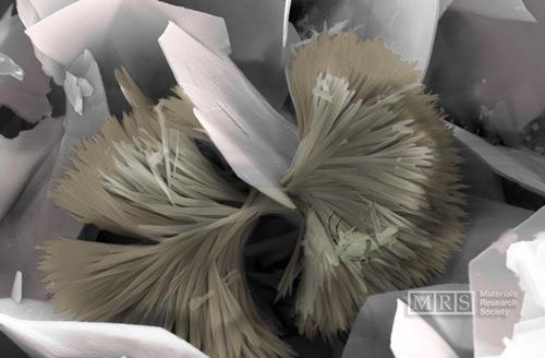 "Гвоздики". Оксид цинка, также осажденный из газа, но уже без химической реакции (физическое осаждение из газовой фазы), может образовывать красивейшие структуры, похожие на фантастические цветы.