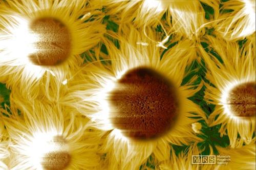 Эти "подсолнухи" выросли не сами, а были синтезированы в ходе реакции кремния с кислородом, где в качестве катализаторов выступали расплавленные галлий и золото. В середине «цветка» нановолокна оксида кремния (толщиной порядка 10 нм, между прочим) упакованы плотно, а по краям – гораздо более рыхло, за счет чего и образуются «лепестки».