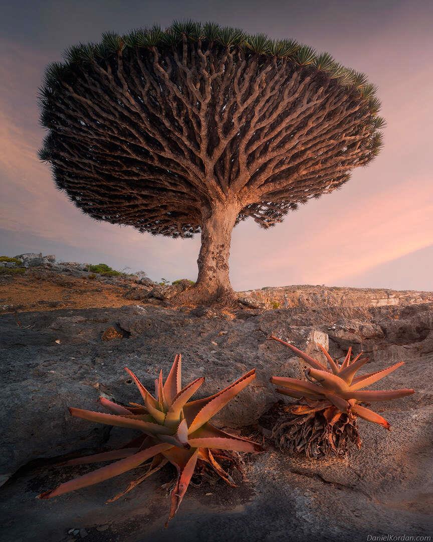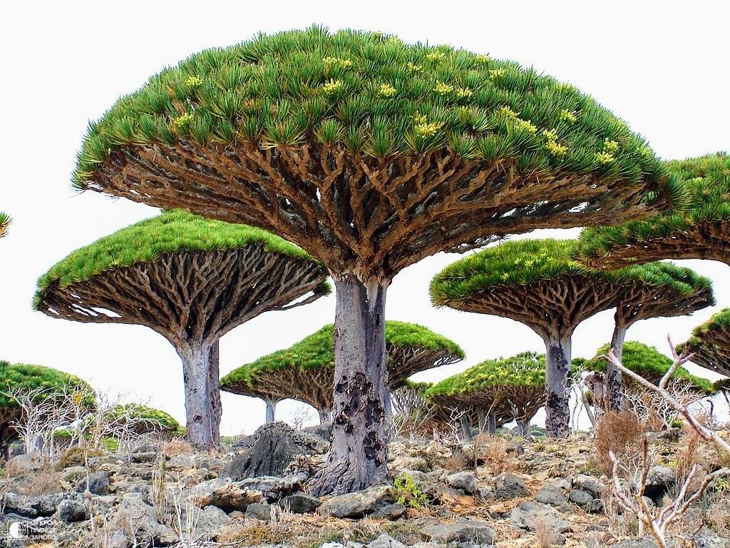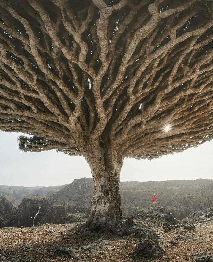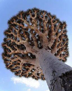 На концах толстых ветвей драцены растут розетки острых листьев, придавая дереву необычный вид, похожий на огромные фантастические зонтики.