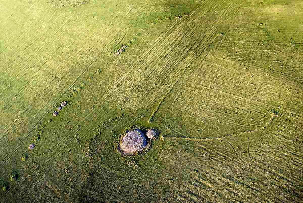 А вот на этом снимке есть и большой каменный курган и маленький, но он не рядом, а по оси «усов». Хотя как сказать «по оси»? Ведь «усы» здесь мало того, что разные по длине, но ещё и несимметричные. Один «ус» сделан по радиусу, а второй сделан почти по прямой, но значительно длиннее: