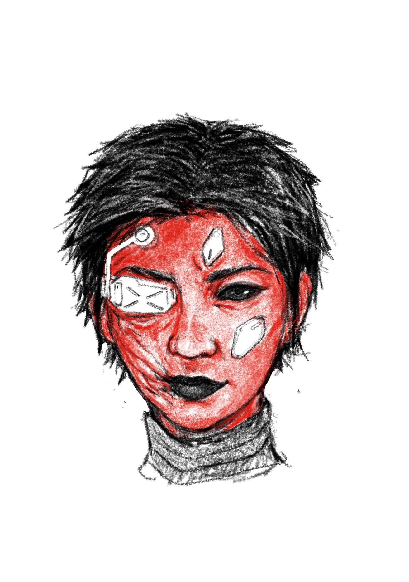 В одной из операций ее подстрелили в голову, в результате чего она потеряла глаз - и, по традиции многих ОС, не стала получать новый биомиметический имплант, оставив внешний базовый протез с расширенным сканером.