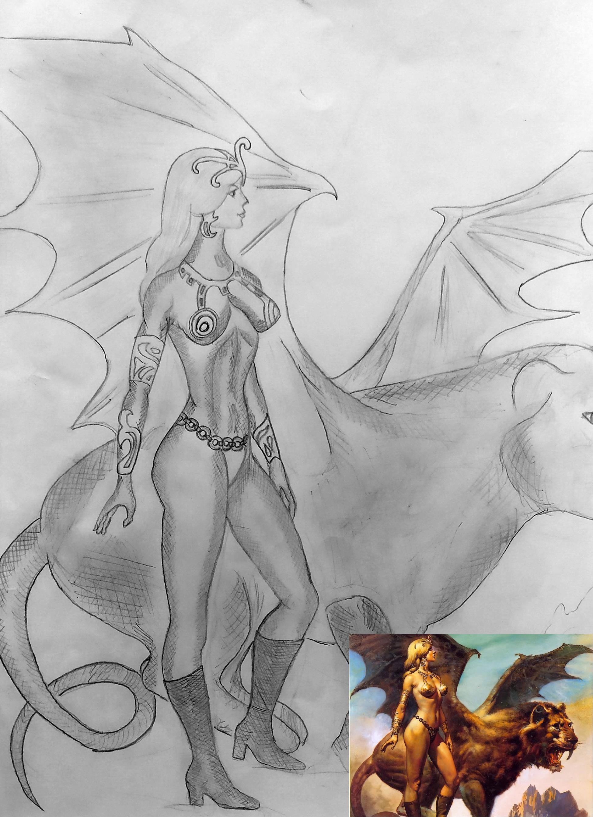 В далеком 1994 году (я ещё в школе учился), попался на глаза альбом с картинами Бориса Валеджо (Вальехо). Половина работ были мне уже известны, поскольку львиная доля обложек бумажных фантастических книг того времени делалась с его иллюстрациями (подозреваю, без соблюдения каких-либо авторских прав). Тем не менее, я был впечатлён! И сделал несколько перерисовок (не стекло и даже не по клеточкам, чем особо горжусь) простым карандашом. Ну, как умел.