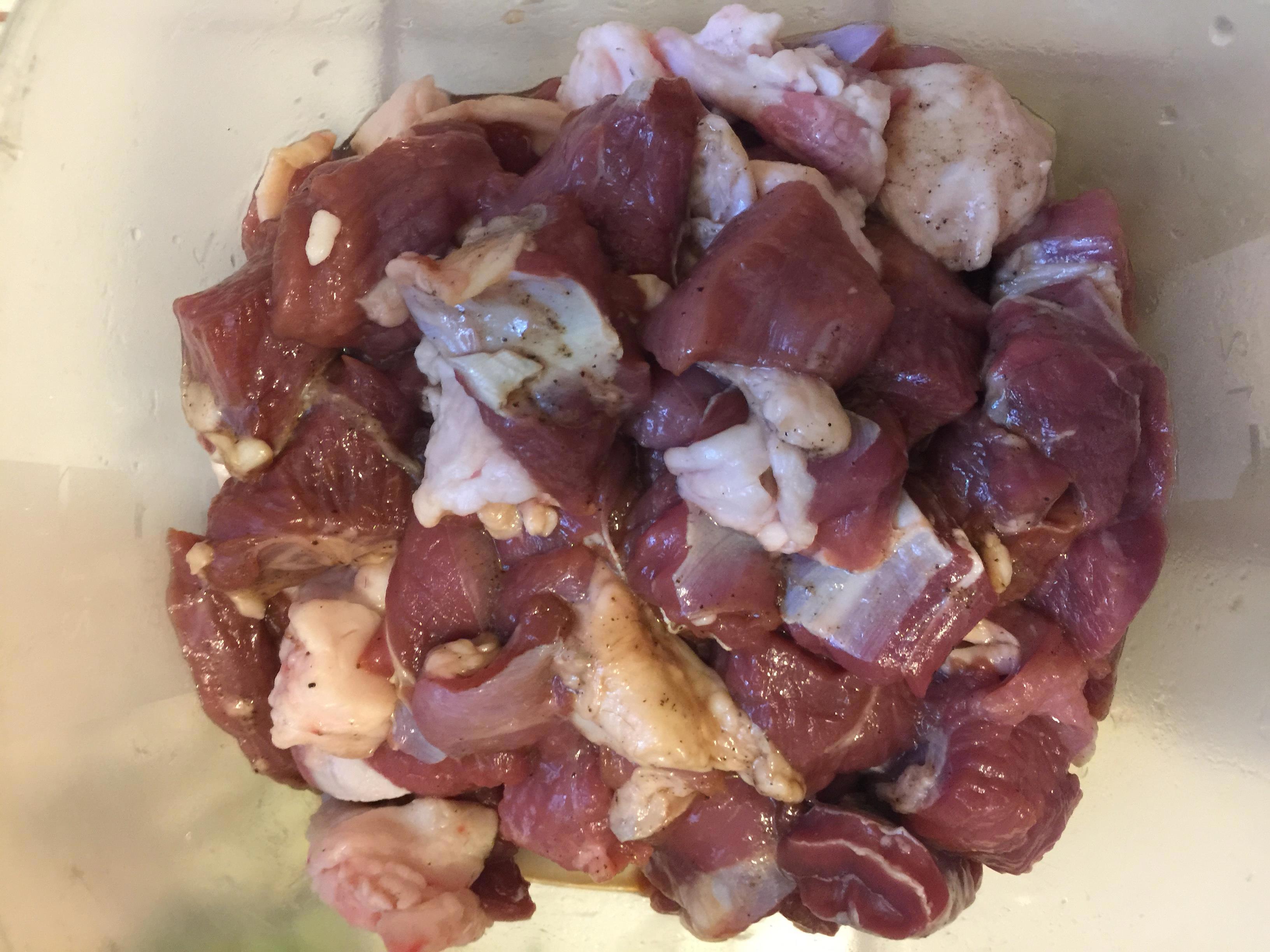 1. Баранину режем небольшими кубиками, заливаем соевым соусом, пересыпаем черным молотым перцем, все тщательно перемешиваем руками и ставим на полчаса мариноваться