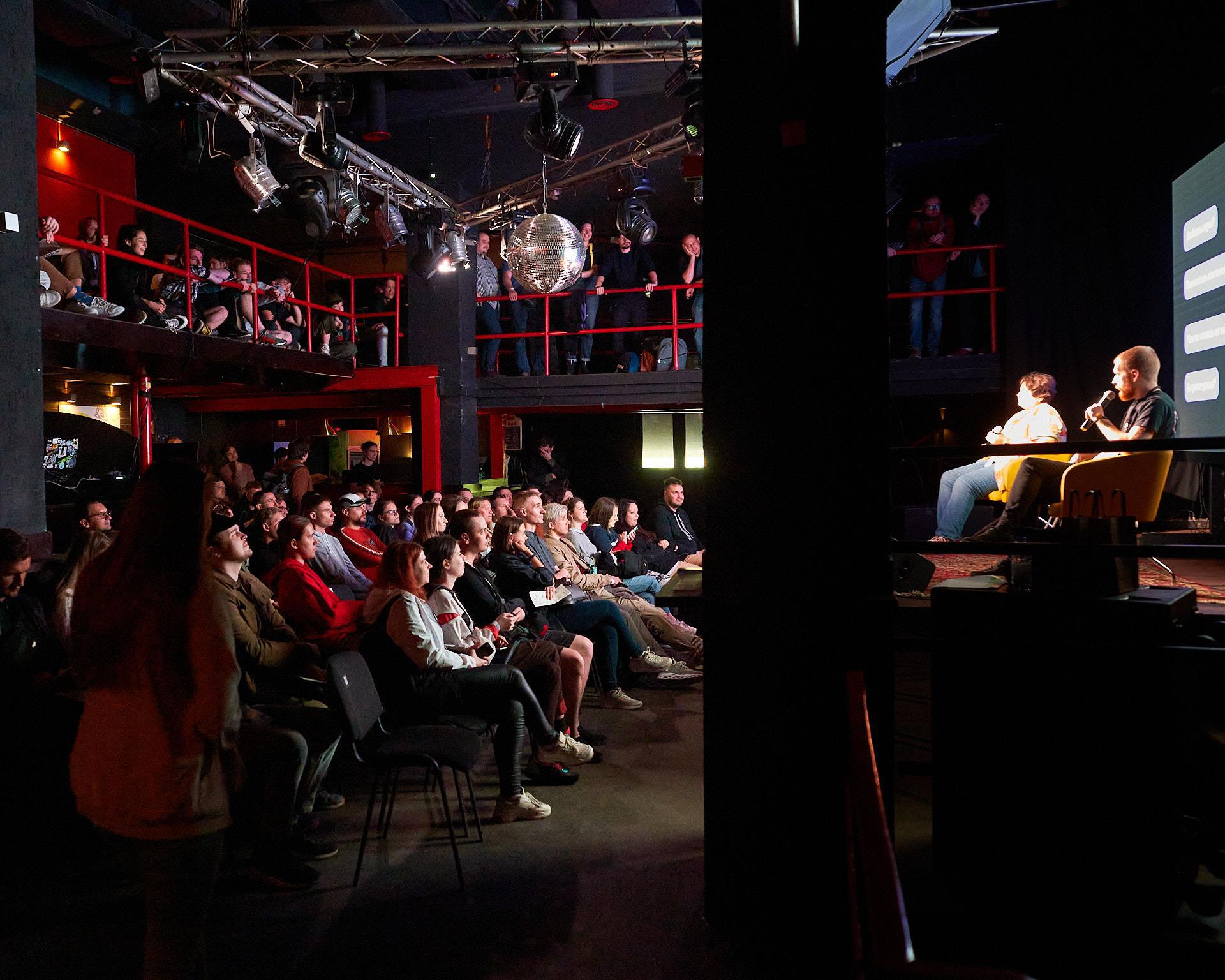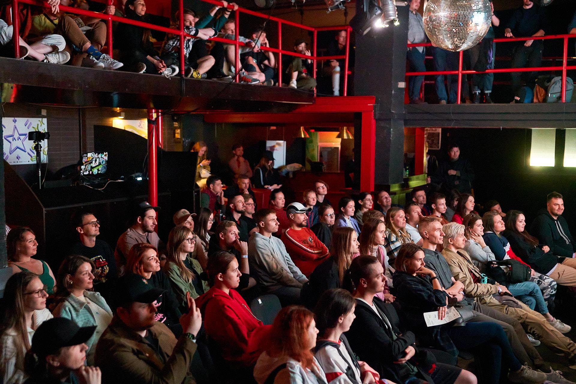 Как я уже говорил, народу битком. Вот сцена на втором этаже, где как рас рассказывали о том, что надо сделать, чтобы прийти в профессии GameDev: