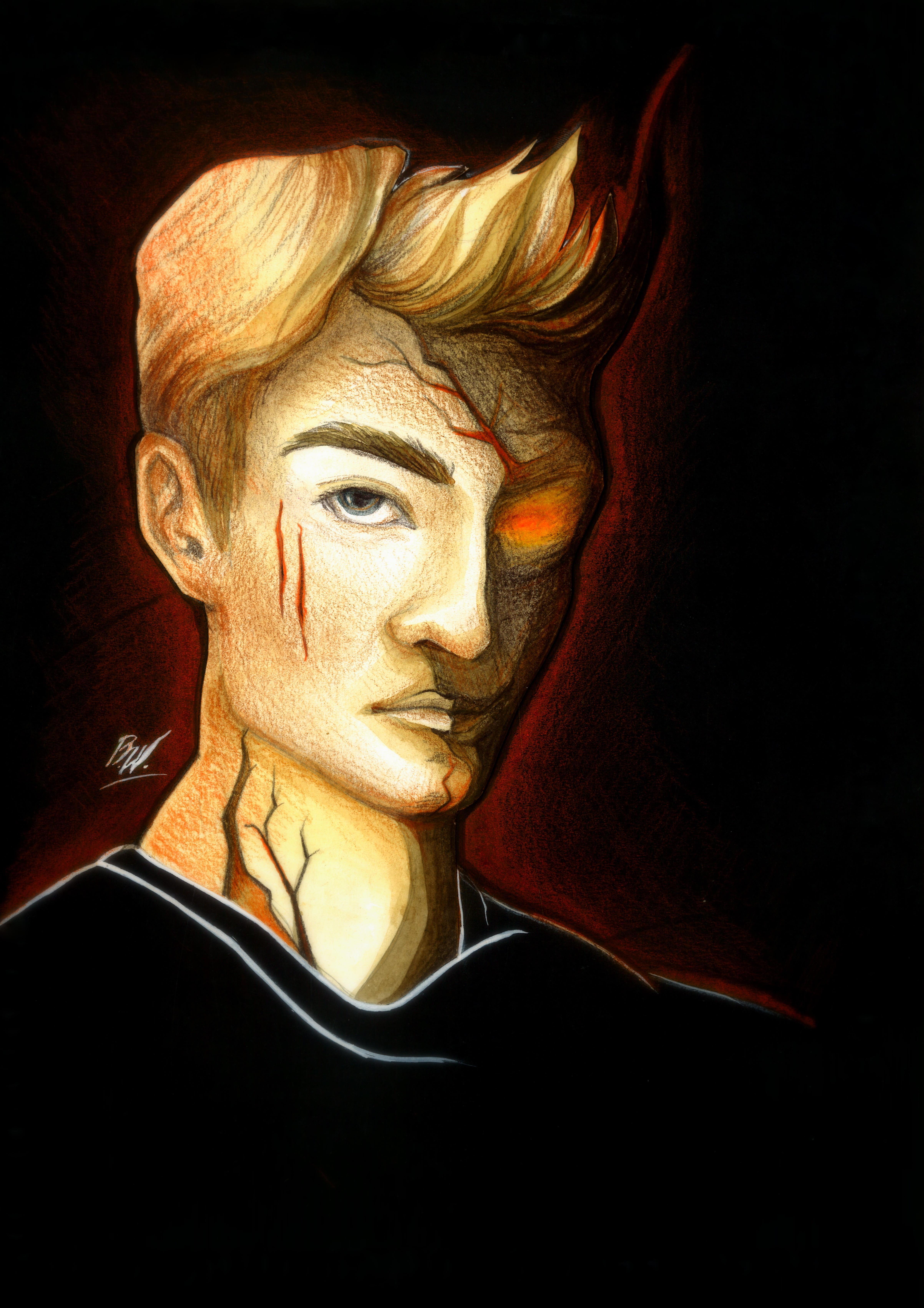 А теперь хочу немного рассказать о самом рисунке. Рина на волне вдохновения нарисовала демону рог, представляя его реально демоном. Ну мы как-то упустили, что демон он больше номинально. И этот рог мне зашёл! Настолько, что теперь он войдёт в канон истории как маленький дополнительный элемент внешности этого мудилы. А дальше два полуспойлера, не имеющие сюжетообразующего значения. Я предупредил, так что тапками прошу не бросаться. Две царапины на щеке отсылают к первому кошмару с Исаевым. Трещины между светлой и тёмной стороной - видоизменённая визуализация видения Сары с ярмарки во втором томе (не будем забывать, что там всё было чёрным и белым, тут же больше цвета). Ну и наконец... оранжевый спойлер для особо внимательных о том, кто же "на самом деле" стоит за кошмарами Мэтта.