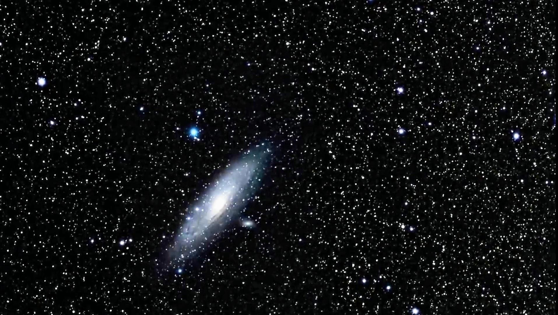 Это видео начинается с наземного обзора ночного неба, прежде чем увеличить изображение галактики Андромеды, также известной как M31, сделанное Хабблом.