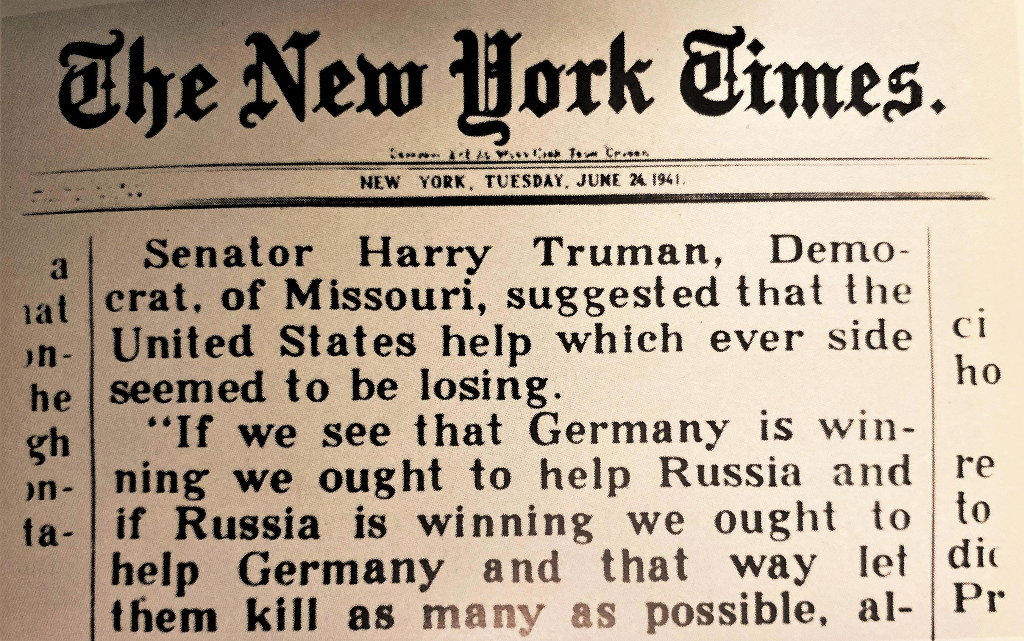 Вот, к примеру, высказывание сенатора от шт. Миссури о начале войны, опубликованное в газете «Нью-Йорк Таймс» 24 июня 1941 года: