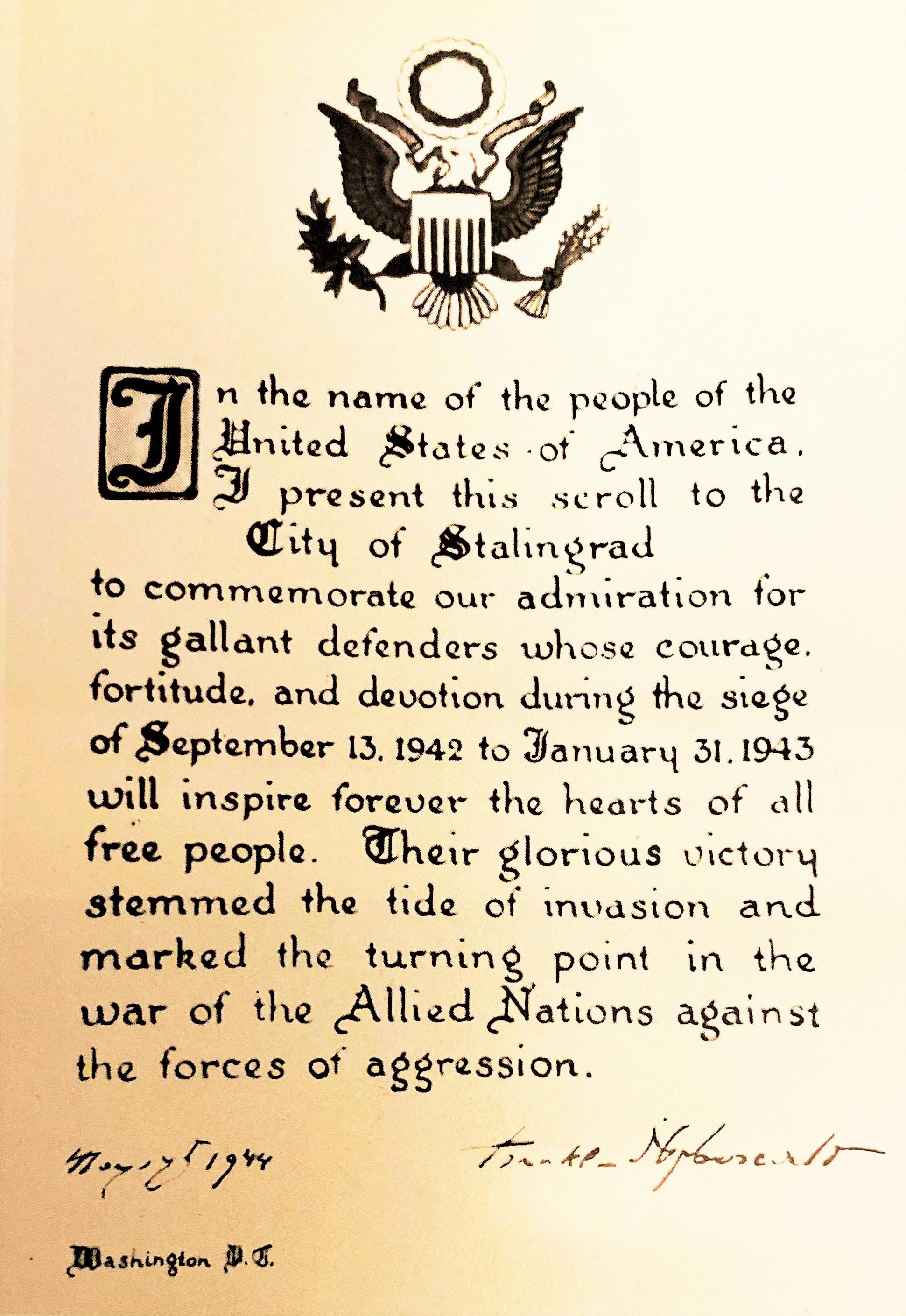 От имени народа Соединенных Штатов Америки я вручаю эту грамоту городу Сталинграду, чтобы отметить наше восхищение его доблестными защитниками, храбрость, сила духа и самоотверженность которых во время осады с 13 сентября 1942 года по 31 января 1943 года будут вечно вдохновлять сердца всех свободных людей. Их славная победа остановила волну нашествия и стала поворотным пунктом войны Союзных Наций против сил агрессии.