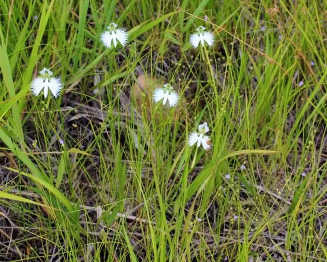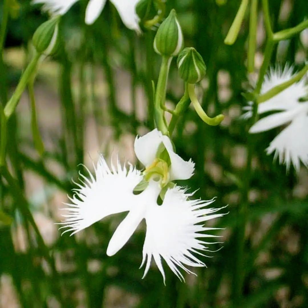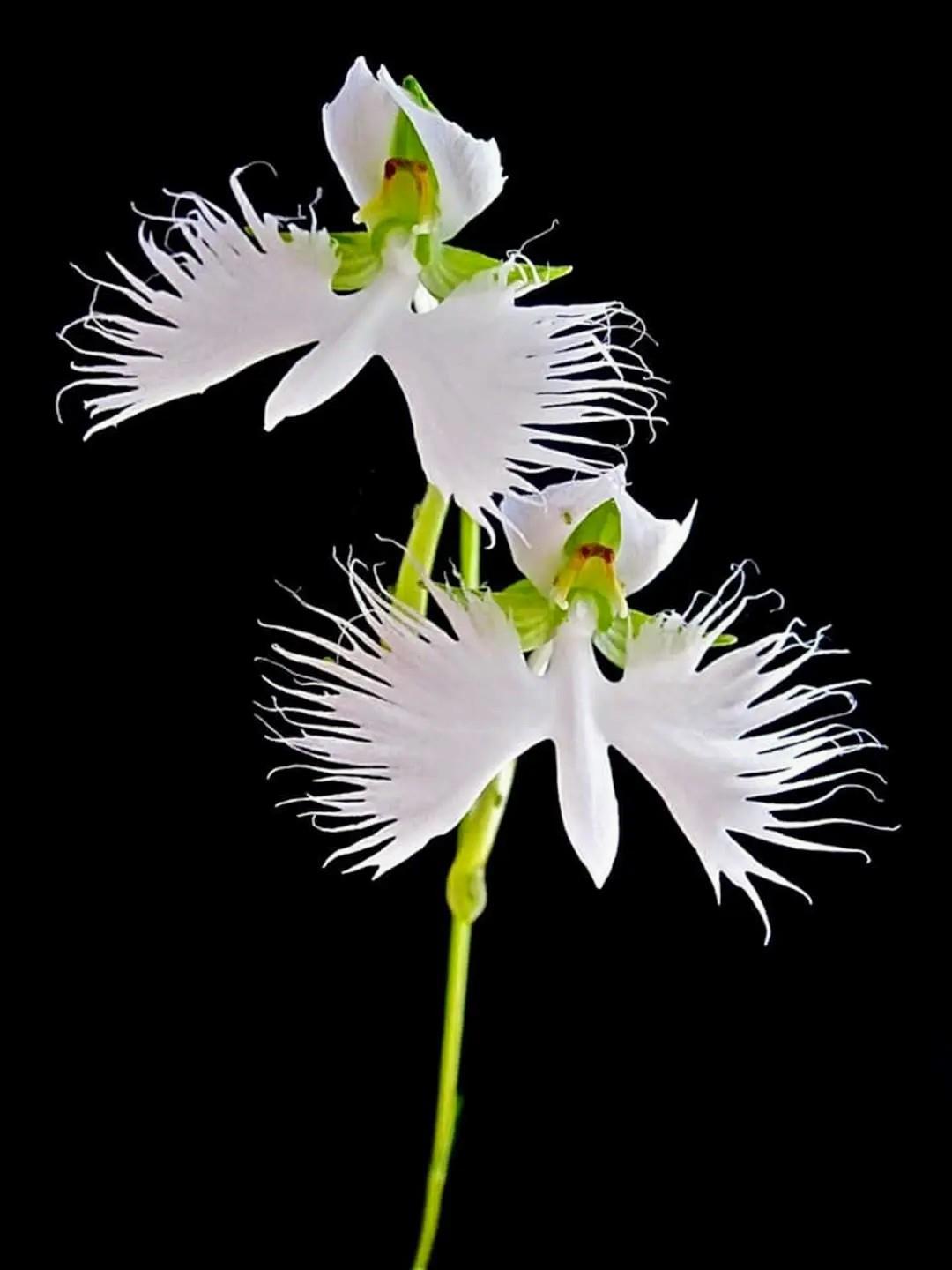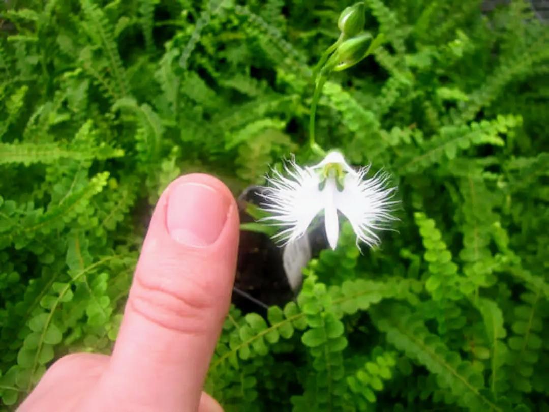 Цветок красивый и крупный, жемчужно-белый с широкой тяжелой бахромчатой губой, напоминающей летящую белую цаплю.