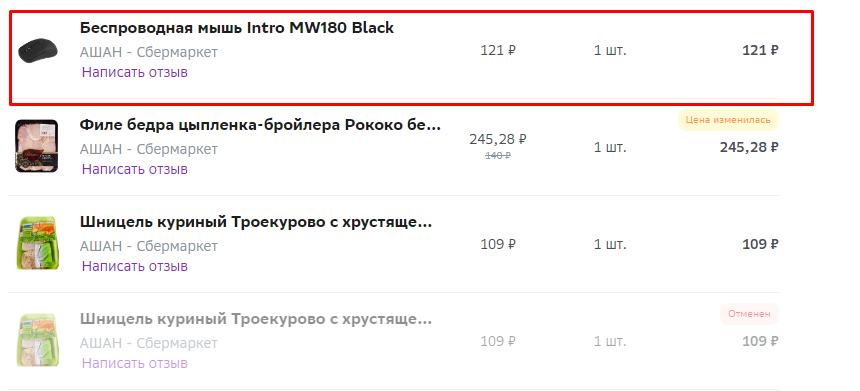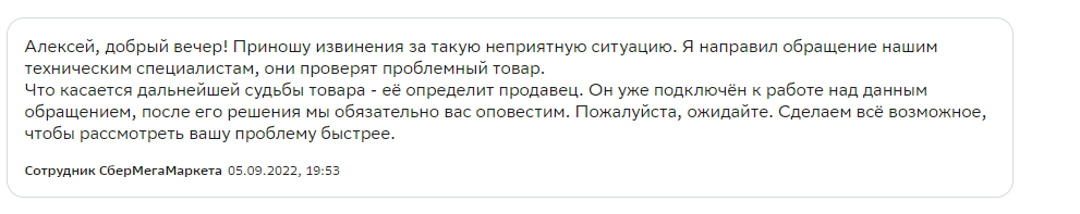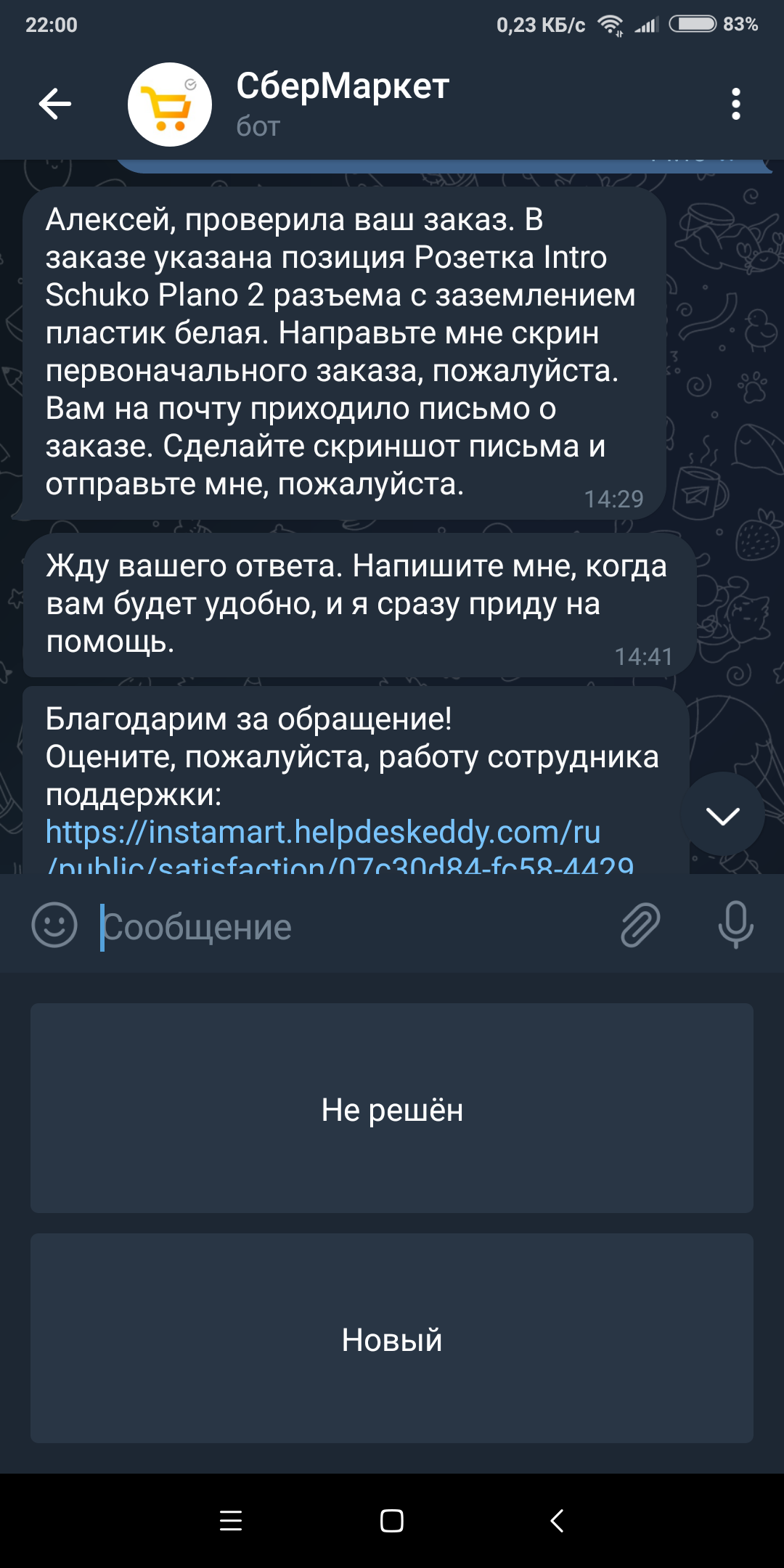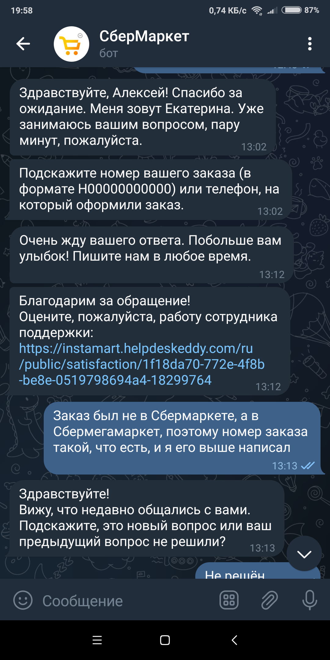 В общем, я понял, что через эту электронную форму в приложении мне видимо ответят не скоро, и мышь я могу вообще не получить. Я также нашел на сайте в браузере, не в приложении, видимо только для более продвинутых пользователей чат… Но там оказался просто бот, который регистрировал обращение и обещал ответить через неделю… Тогда я попробовал написать в тот чат Сбермаркета. Да, это другая голова, но она занимается непосредственно сбором и доставкой.