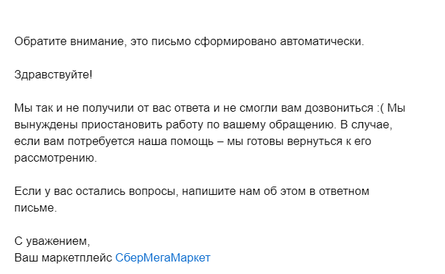 На следующий день, уже не надеясь получить никаких ответов раз три дня у них срок, я вдруг в почте обнаружил письмо. Причем я ждал ответ ведь в приложении в специальной форме, где было мое обращение в техподдержку. А они еще в тот день отправили почему-то ответ на почту, причем от Сбермаркета, а не Сбермегамаркета… Вы еще не запутались? Ничего страшного, эти головы там сами давно перепутались и забыли какую как зовут и за что какая отвечает.