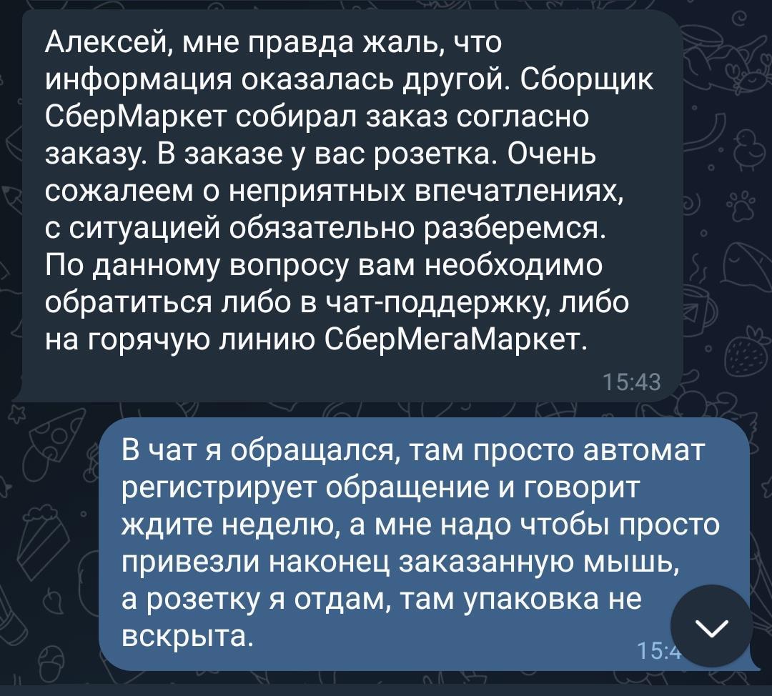 - В общем, мы крайне извиняемся, у нас в компе стоит розетка вместо мыши. И в тексте заказа тоже оказалась розетка. Так что Сбермаркет тут вообще не виноват, раз нам пришло в заказе розетка, то сборщик положил розетку, курьер доставил розетку. Сделайте скриншот заказа.