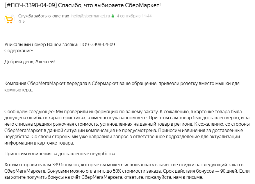 Сбермаркет мне написал, что вообще страшно переживают, как так лоханулись, но в какой-то карточке товара указан не правильный вес, поэтому произошла ошибка, простите-извините. Но мышь доставить не можем, это не предусмотрено в принципе. Давайте мы вам 339 бонусных баллов дадим и разойдемся, а? Напишите ответом на это письмо, если согласны.