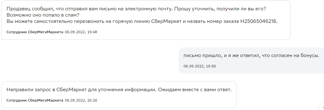 Проходит опять день. И снова приходит ответ в приложение, и опять другой. Что мол мы тут все еще разбираемся, и вам уже Сбермаркет отвечал, что согласен 339 баллов бонусами дать, но ответа не получили, так вы согласны?