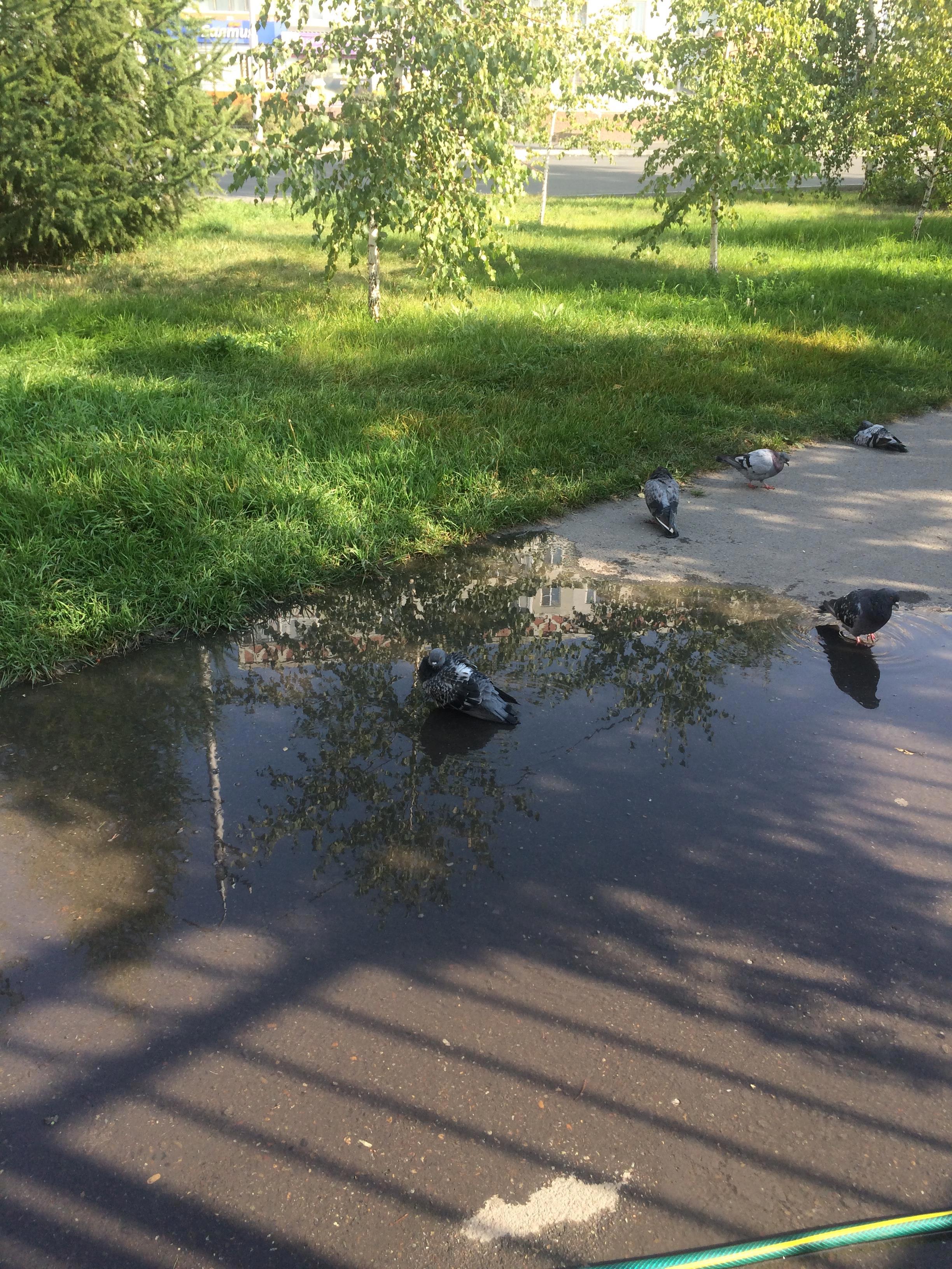 И вот он - настоящий летний день в сентябре! С утра небо солнечное, ясное. Голуби купаются в лужах.