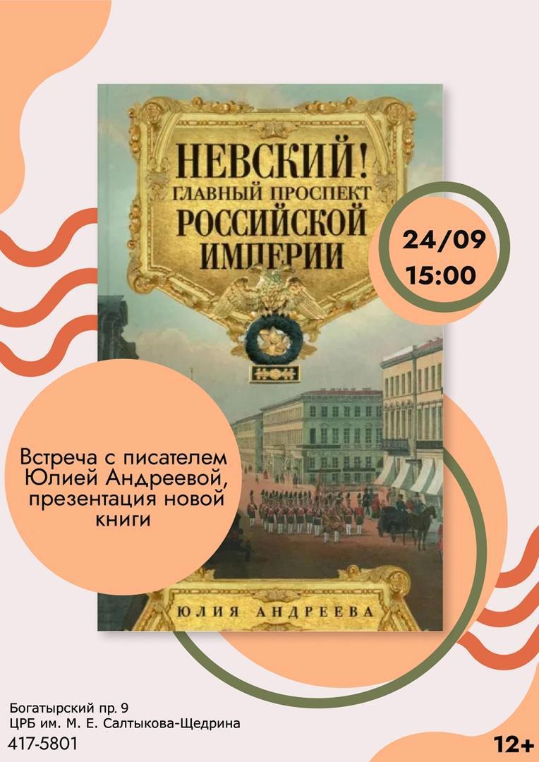 24 сентября в 15.00 презентация книги Ю.Андреевой "Невский! Главный проспект Российской империи" библиотека Салтыкова-Щедрина Богатырский, 9