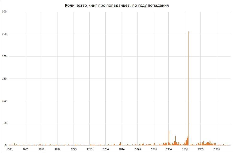 Николай Кульбака на основе 1081 русскоязычной книги о попаданцах составил диаграмму "в какие года они попадают". И вы знаете, я не удивлён.