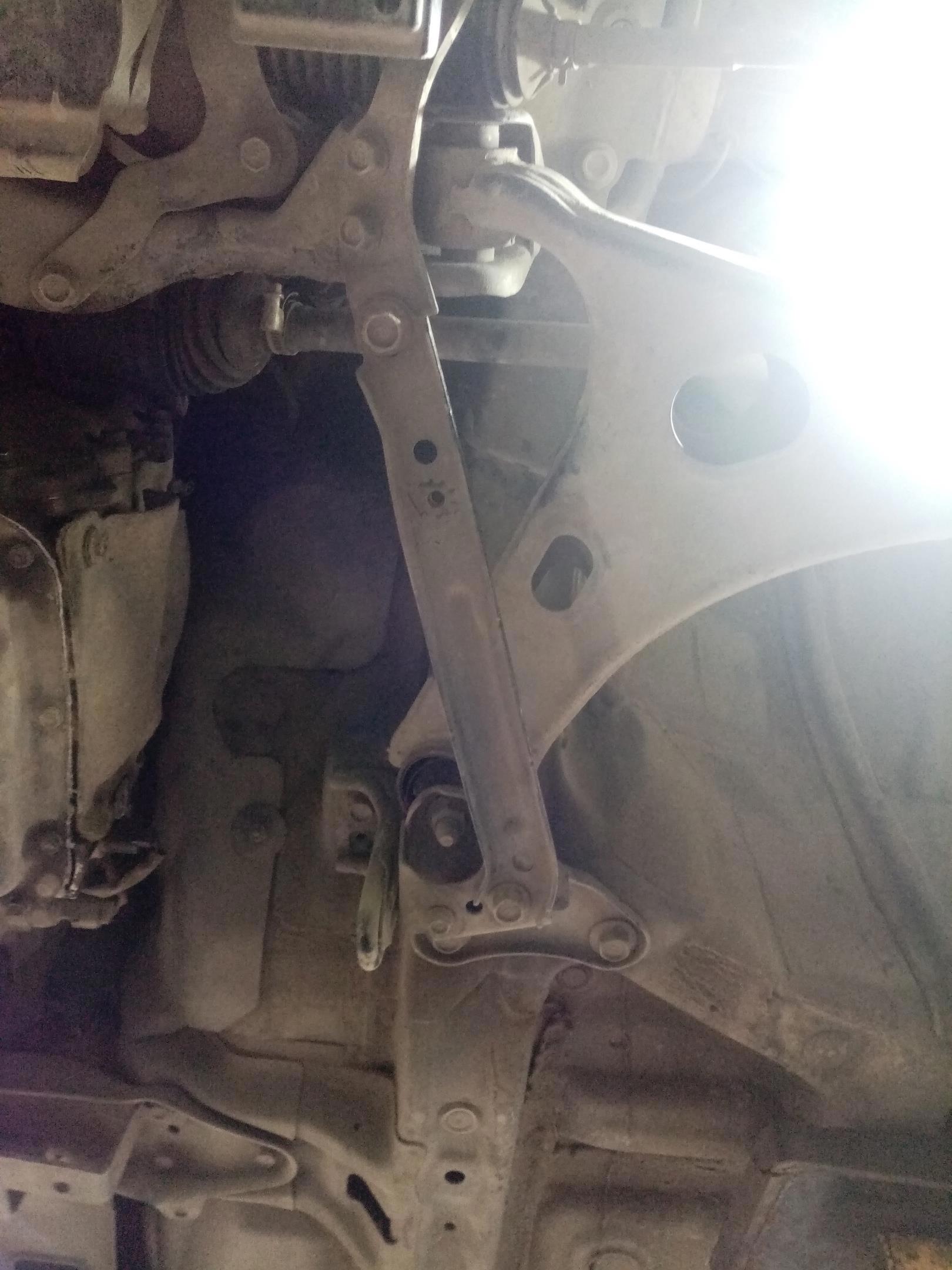 Но к делу. Надо заменить задний сайлентблок переднего левого рычага. Обычно рычаг крепится двумя болтами к подрамнику. Но это же Субару! Тут всё сделано через зад.