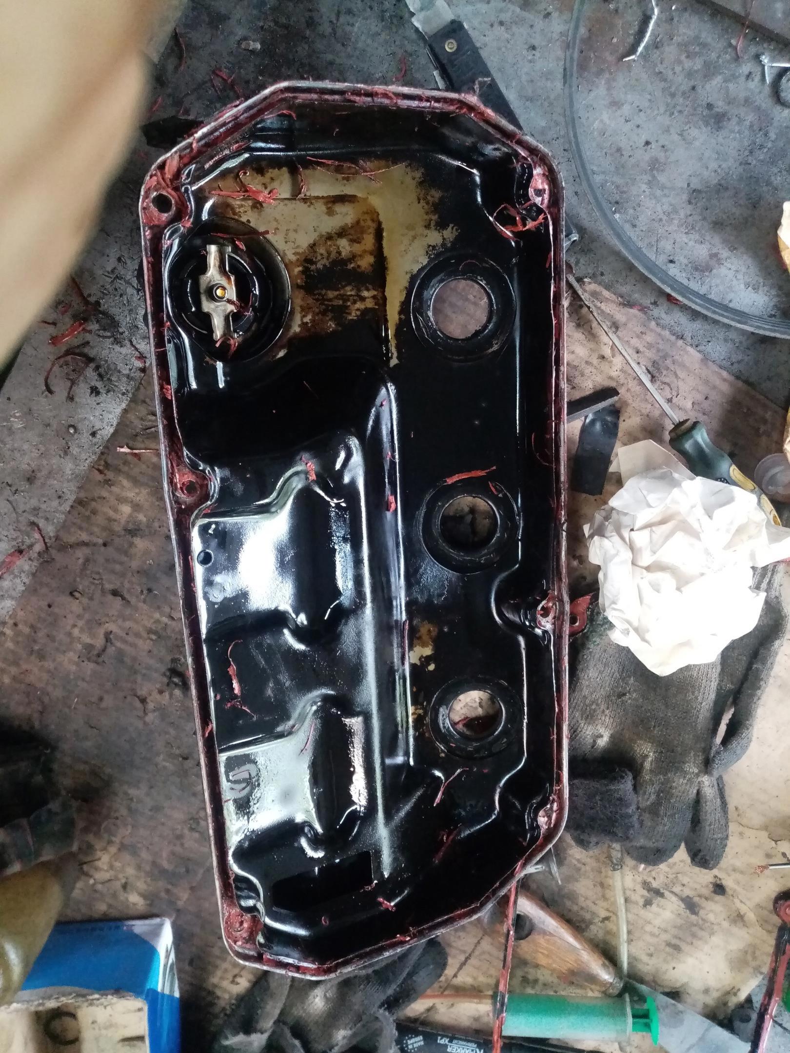 Я уже не первый, кто вскрывал эту крышку, и до меня туда лазили какие-то лютые варвары. Место укладки прокладки всё погнуто, болты были затянуты со всей силы, места установки болтов погнуты, ибо крышка штампованная стальная, хотя момент затяжки там 5 н.м, это от руки чуть подтянуть. Пришлось всё править.