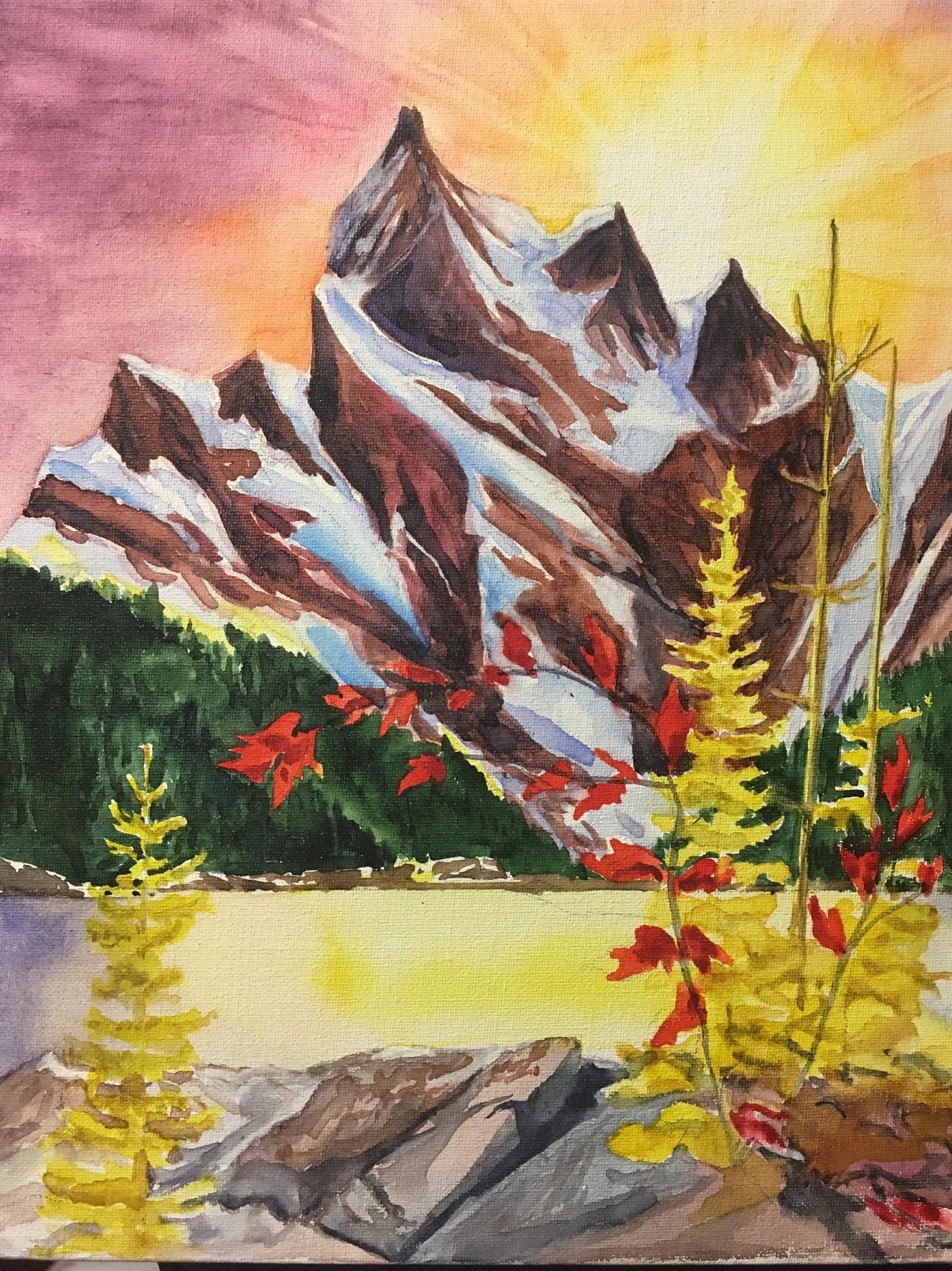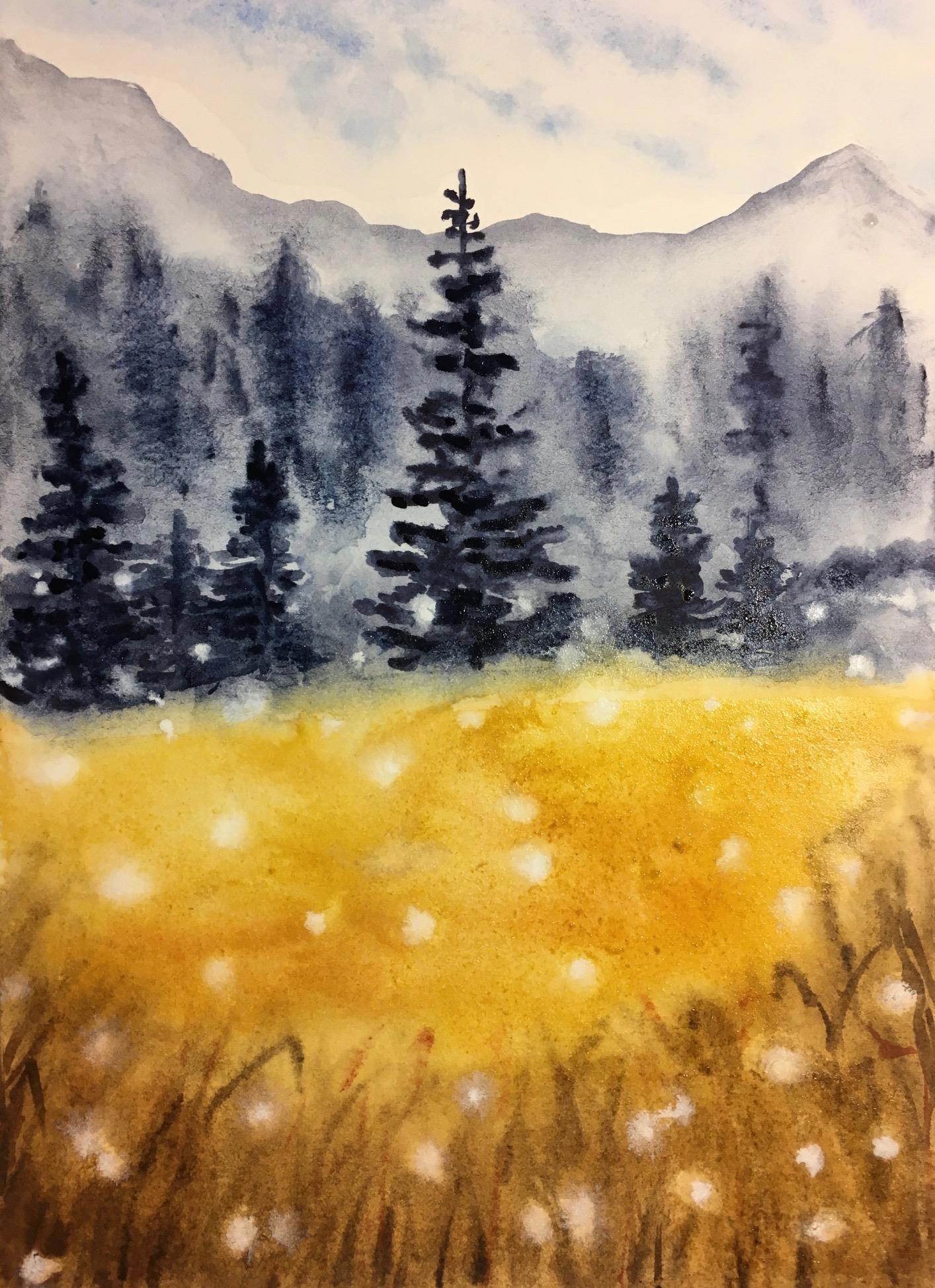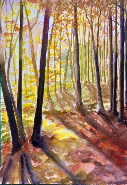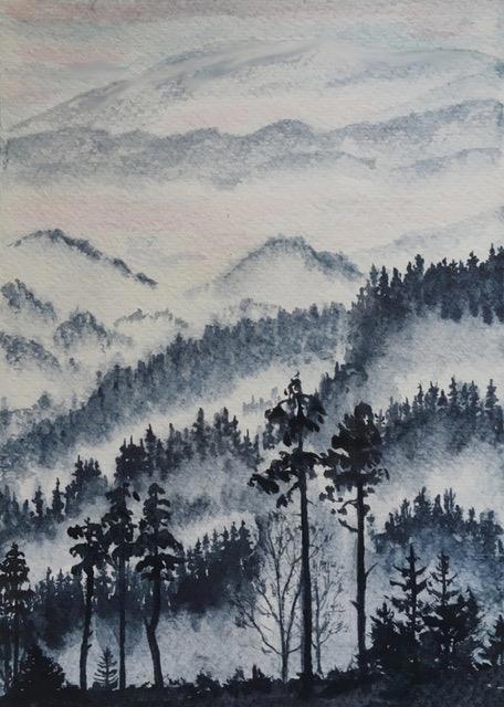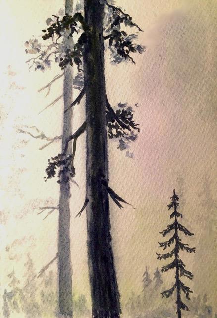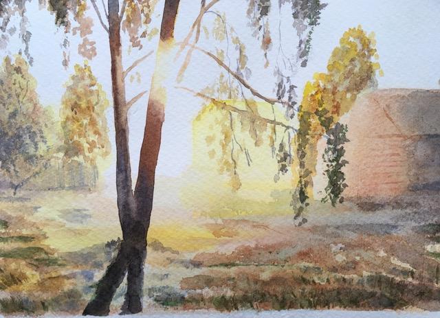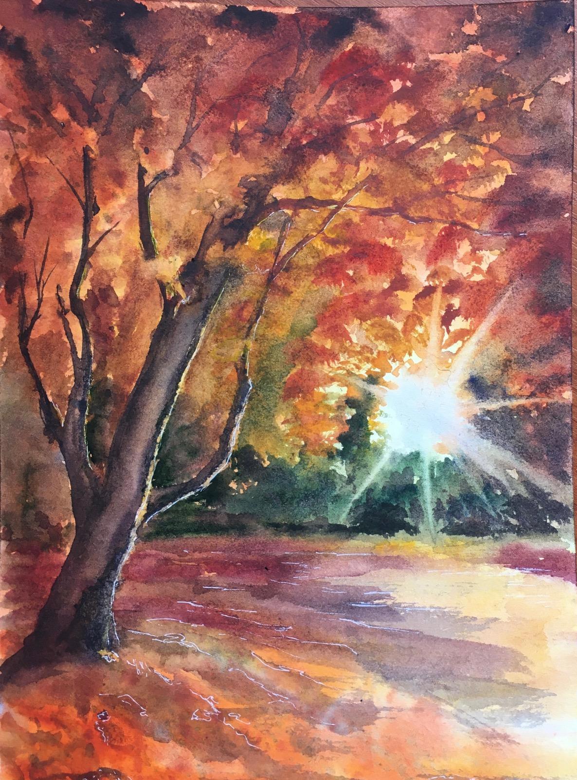 Продолжу вертикальненькими... По мастер-классу тут только четвертая (жестковато вышло, но светится), остальное с фотореференсов, желтеющие листья березки с улицы на моем перекрестке, закат, окрасивший туман в лесу в цвет пожара - своя фантазия.