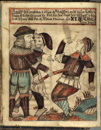 Высокий говорит: «Второй сын Одина — это Бальдр. О нем можно сказать только доброе. Он лучше всех, и его все прославляют. Так он прекрасен лицом и так светел, что исходит от него сияние. Есть растение, столь белоснежное, что равняют его с ресницами Бальдра, из всех растений оно самое белое. Теперь ты можешь вообразить, насколько светлы и прекрасны волосы его и тело. Он самый мудрый из асов, самый сладкоречивый и благостный. Но написано ему на роду, что не исполнится ни один из его приговоров. Он живет в месте, что зовется Брейдаблик, на небесах. В этом месте не может быть никакого порока, как здесь об этом сказано: