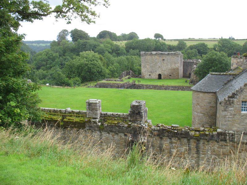 Это огромная цитадель, от которой осталось всего ничего. Крейгнитен расположен на утесе, образованном руслами двух водотоков, Нитен-уотер и Крейгнитен-берн. Утес имеет форму треугольника, в вершине его – высшая часть утеса и башня с личными покоями хозяина и холла, в основании – первая линия обороны в виде стены и въездные ворота, стена и ворота были поставлены, скорей всего, уже после казни Джеймса Гамильтона. Несмотря на то, что он был обвинен Джеймсом V в государственной измене и казнен, цитадель оставалась и дальше в руках семьи Гамильтон. За внешней стеной – типичной для времени сооружения – снабженной по углам четырехугольными башнями, находится внутренний двор, весьма обширный, и там вот, собственно, и расположены были основные оборонительные сооружения – ров, чья вертикальная стена аккуратно вымощена булыжником, внутренняя стена, полностью закрывающая собой жилые здания, два капонира, встречно перекрывающие огнестрелом ров – и тех наивных, которые туда таки залезут… на месте одного капонира в конце XVI века была сооружена траверсная стена для той же оборонительно-наступательной цели. В капониры вели винтовые лестницы с нижних ярусов башен защитной стены. Там, где теперь через ров перекинут пешеходный мост – ни моста, ни ворот никогда не было, а была глухая каменная кладка. У замка было трое ворот (не считая центральных, подъездных), и расположены они были за защитной стеной, южные были поздней заложены, западные – за жилой башней – видимо, выходили под утес и были, так сказать, служебными.