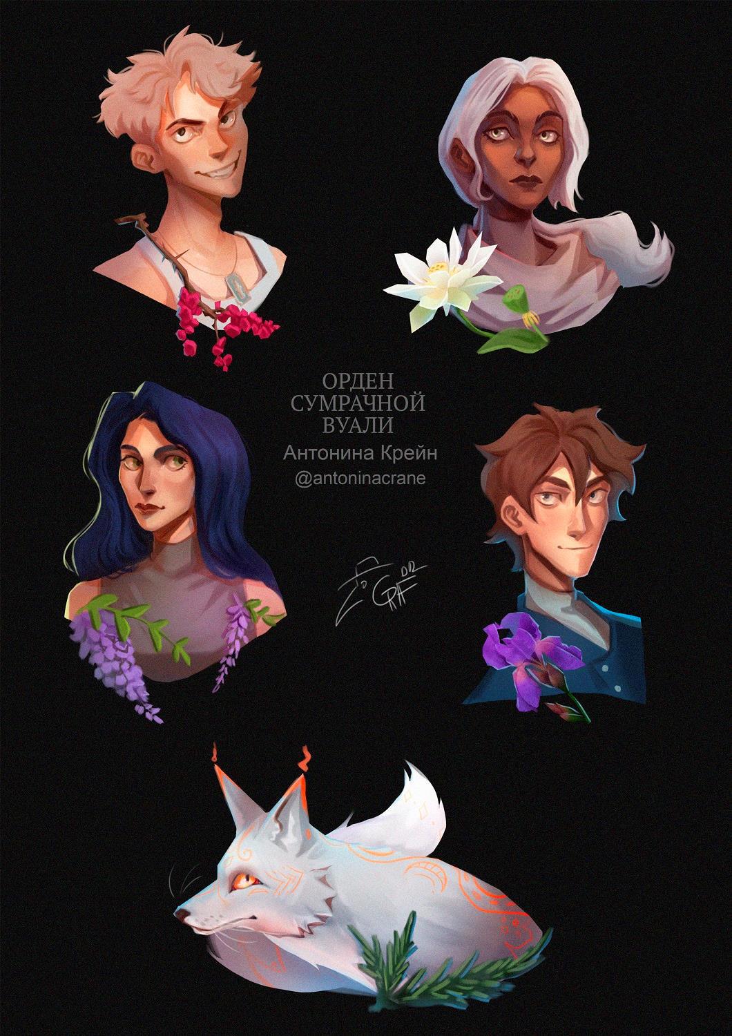 Портреты трех главных героев + еще двух второстепенных, художница Граф: