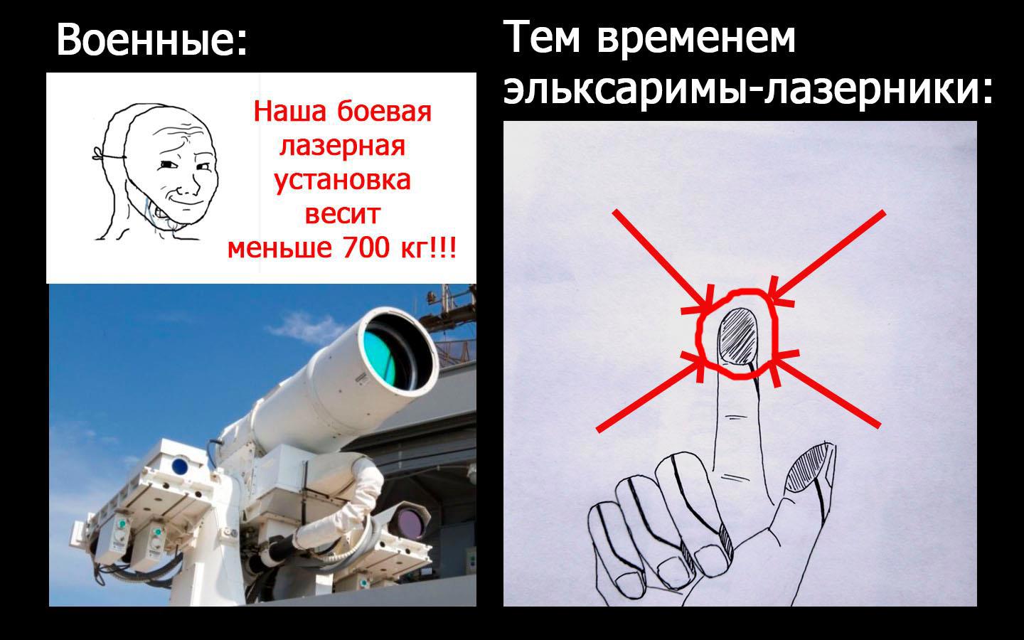 Справедливости ради стоит отметить, что дальность поражения того, что на первой картинке, в 1000 раз больше того, что на второй... Но блин, оно меньше, чем лазерная указка! И при этом мощность на уровне, как у любого поражающего лазера эльксарима.