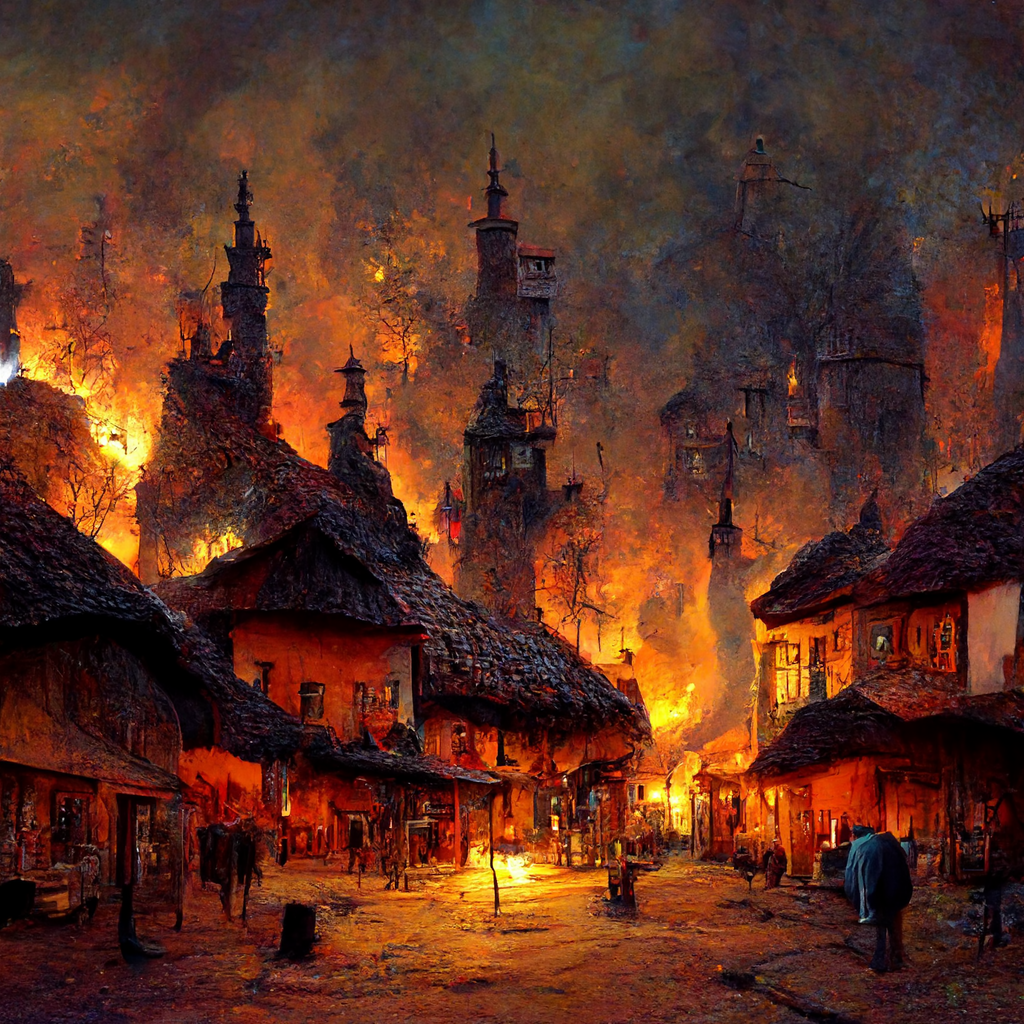 1. Средневековый город в огне, фэнтезийный стиль (естественно, вбивала на английском). Вариант промежуточный, можно еще было посидеть.