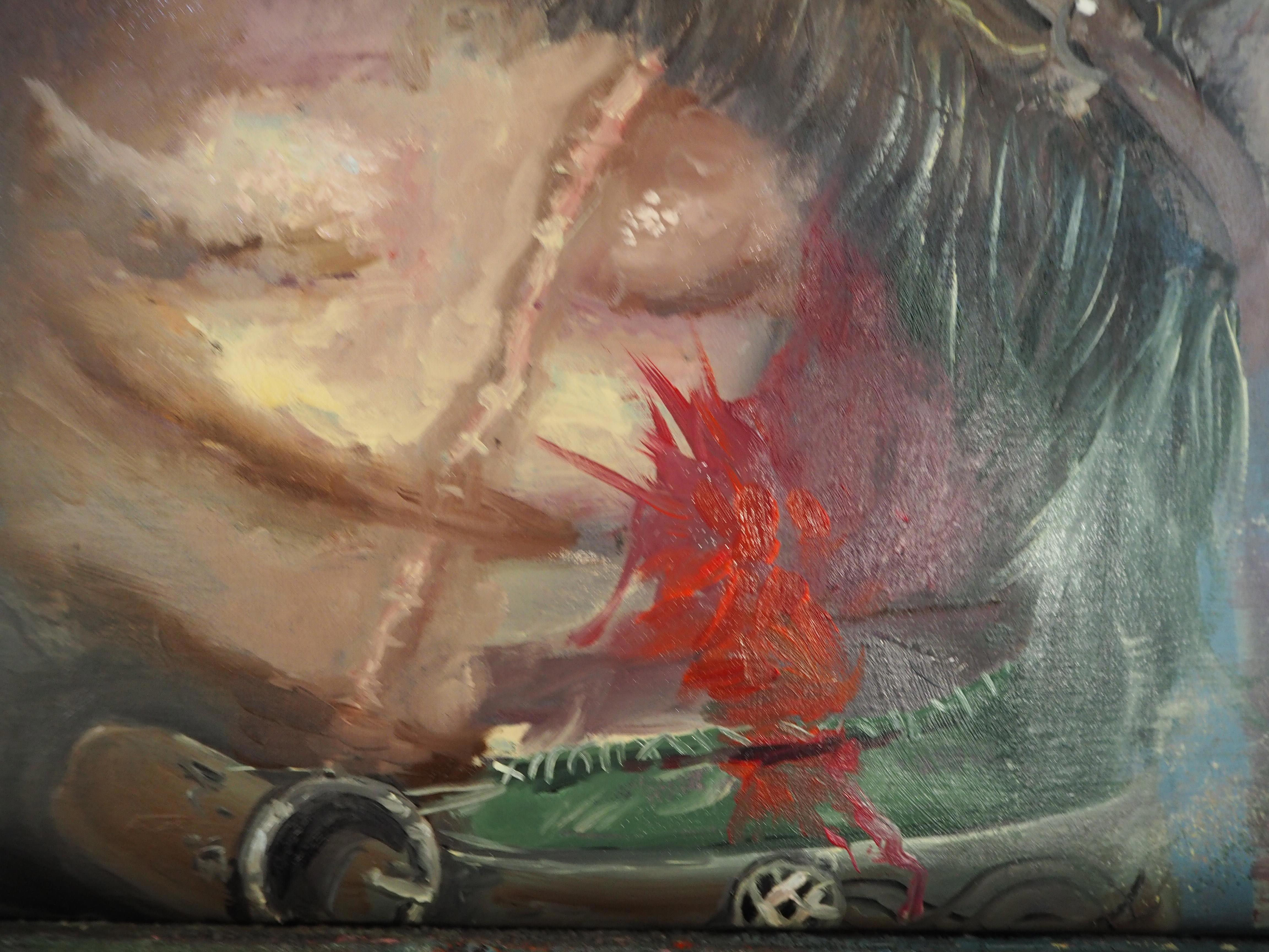 Работала над руками, шрамом на животе, топором и поясными деталями.
