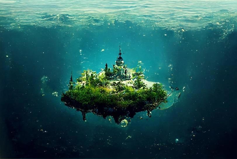 underwater island floating in the deep sea, colourful reef, water surface, clear water, photography, intricate details, highly detailed, 8K, cinematic lighting, realistic, photo realism, sharp focus, unreal engine