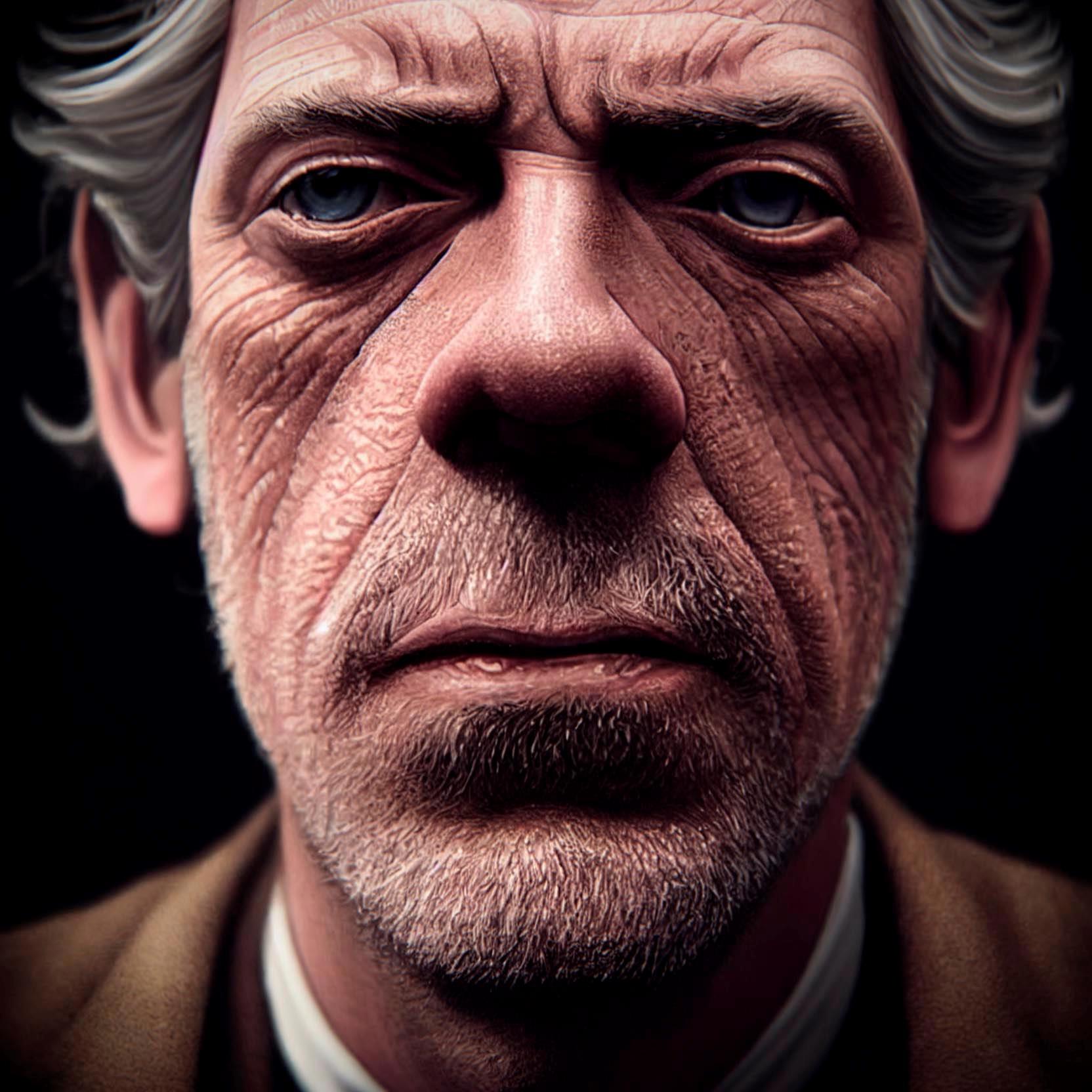 close up very old Hugh Laurie with big nose, wrinkles and white hair, intricate stunning highly detailed man by artgerm and RHADS, portrait, soft studio lighting, ultra realistic, photorealistic, octane render, unreal engine, hyper detailed, volumetric lighting, hdr, fantasy, 4k, 8K --no beard --ar 3:4 --test --creative --upbeta --upbeta