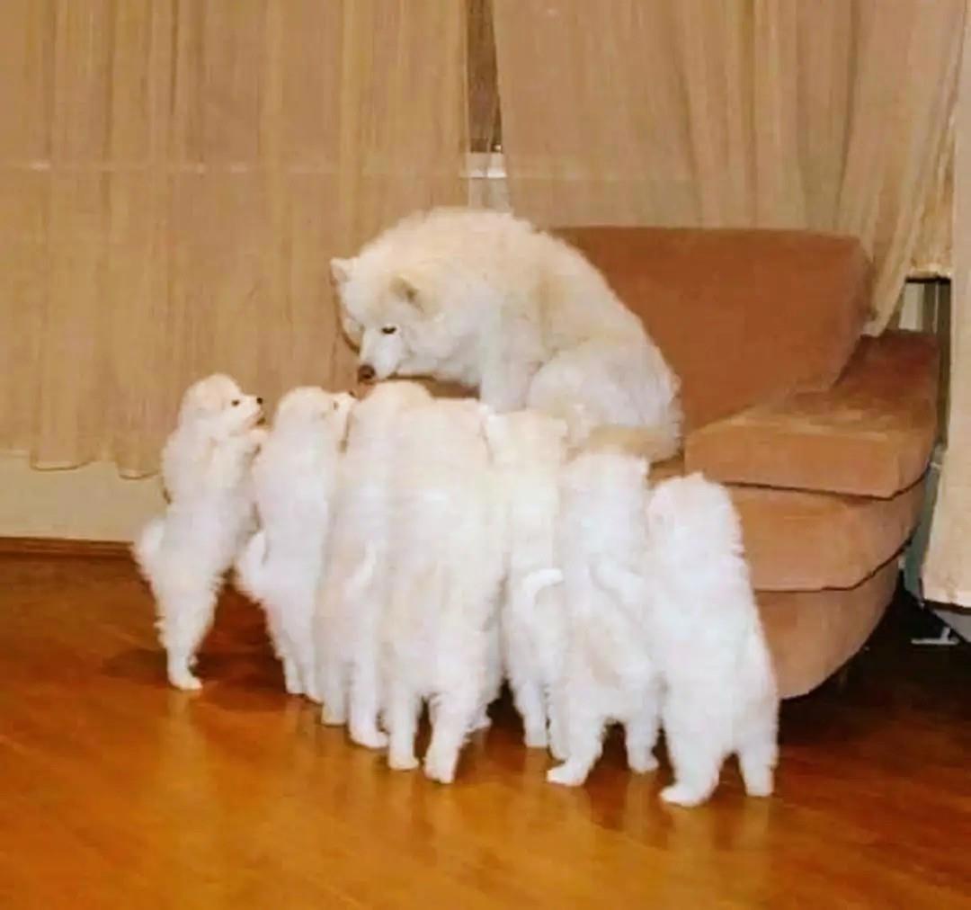 Щенки уже подросли и стараются уже выбраться из под опеки :)