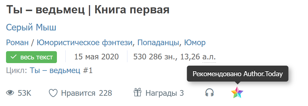 Сегодня совершенно случайно увидел у своей книжки разноцветную звёздочку. Доволен, как слон. Хотя, на статистику чтения это вообще не повлияло. Как забегали раньше случайные читатели по одному-два-три в неделю (считаю только тех, кто дочитал), так и продолжается на том же уровне. Но всё равно приятно. Заметили. Оценили. ;)
