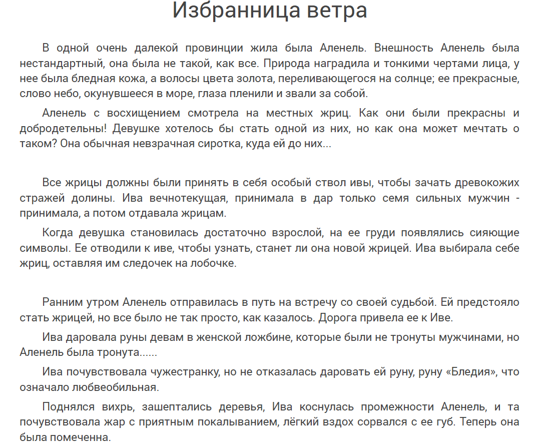 Мне понравилось, что автор сразу, во второй строке сказал нам, что Аленель нитакая. Обычно к этому читателя как-то мягче подводят, иной раз и догадываться приходится, но здесь всё чётко. Всё, кроме того, что ложбина была женская и мужчин туда не пускали, но каким-то образом мужское семя в иве всё-таки оказывалось. То есть не только ива ахала девушек, но и мужики ахали иву. Возможно, стоит им рассказать, что вечнотекущую похотливую посредницу из процесса можно исключить. Но кто мы такие, чтобы лезть в чужой гениальный сюжет со своей банальной Камасутрой?