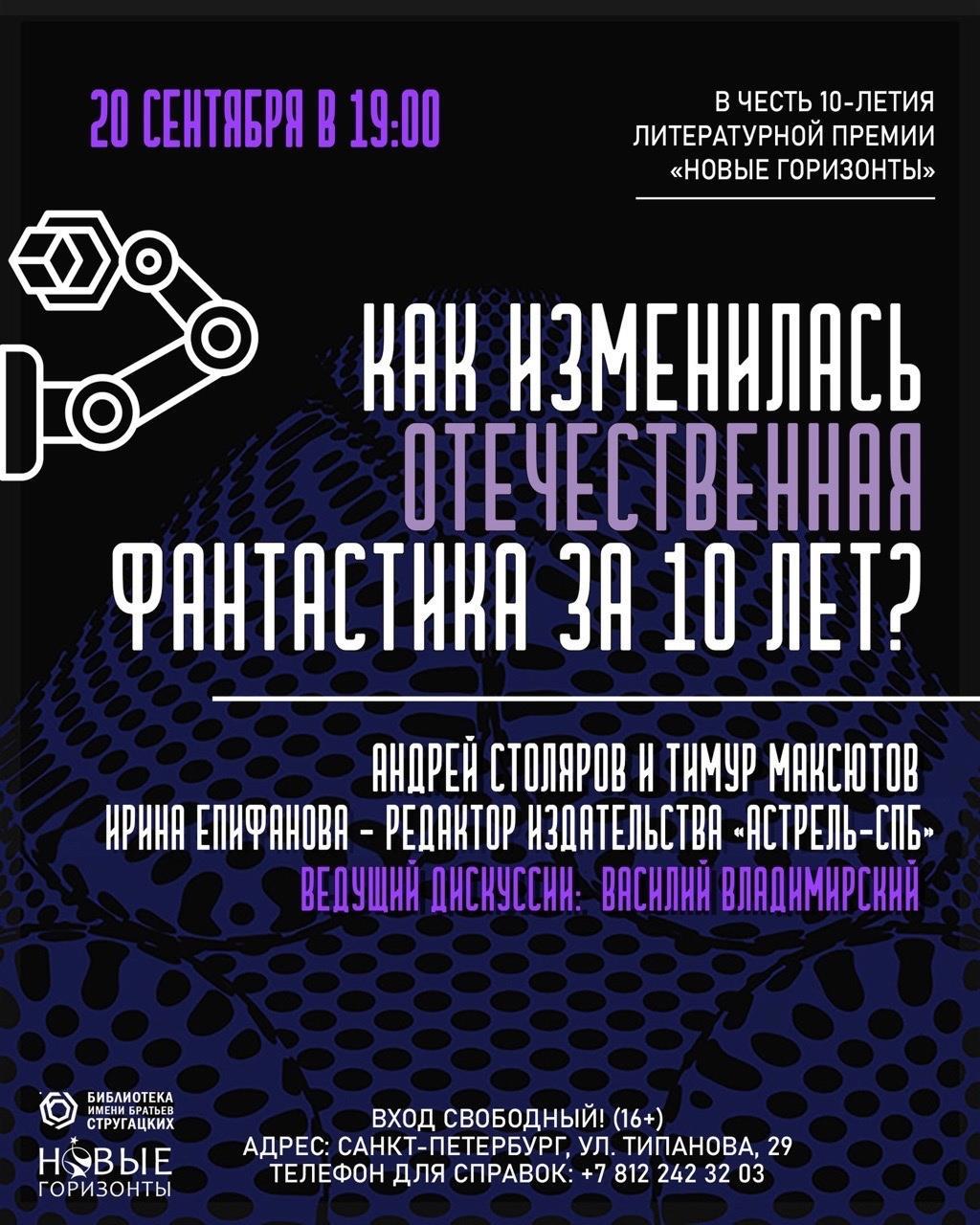 В честь 10-летия литературной премии «Новые горизонты» её организаторы — книжные обозреватели и исследователи фантастики Сергей Шикарев и Василий Владимирский — проведут цикл мероприятий на тему: «Как изменилась отечественная фантастика за 10 лет?»