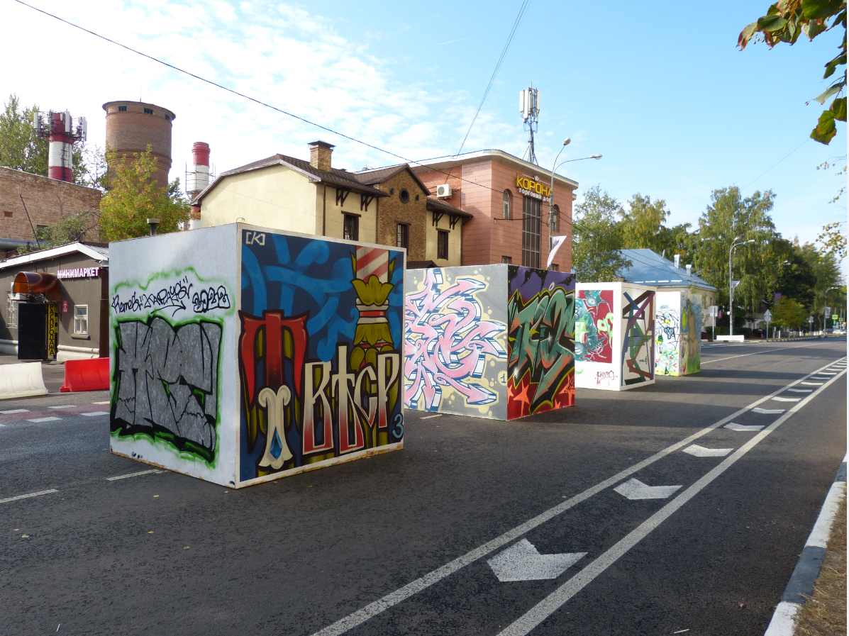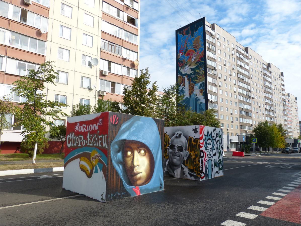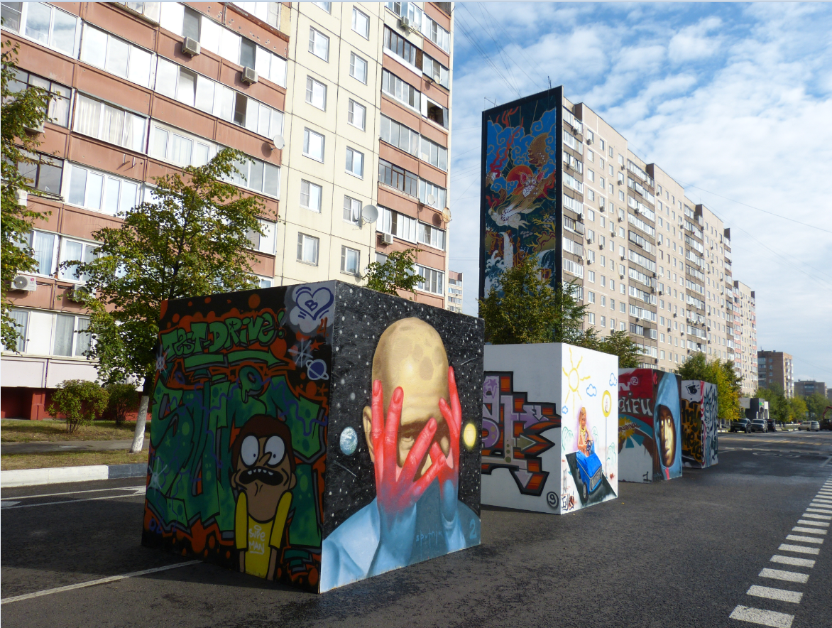 Логичнее всего начинать осмотр с самого начала улицы Новой: там довольно интересно расписали торцы четырёх смежных домов, плюс несколько кубических блоков, на которых могли порезвиться художники, установили прямо на проезжей части. Понятно, что этот кусочек улицы закрыли для автомобилей.
