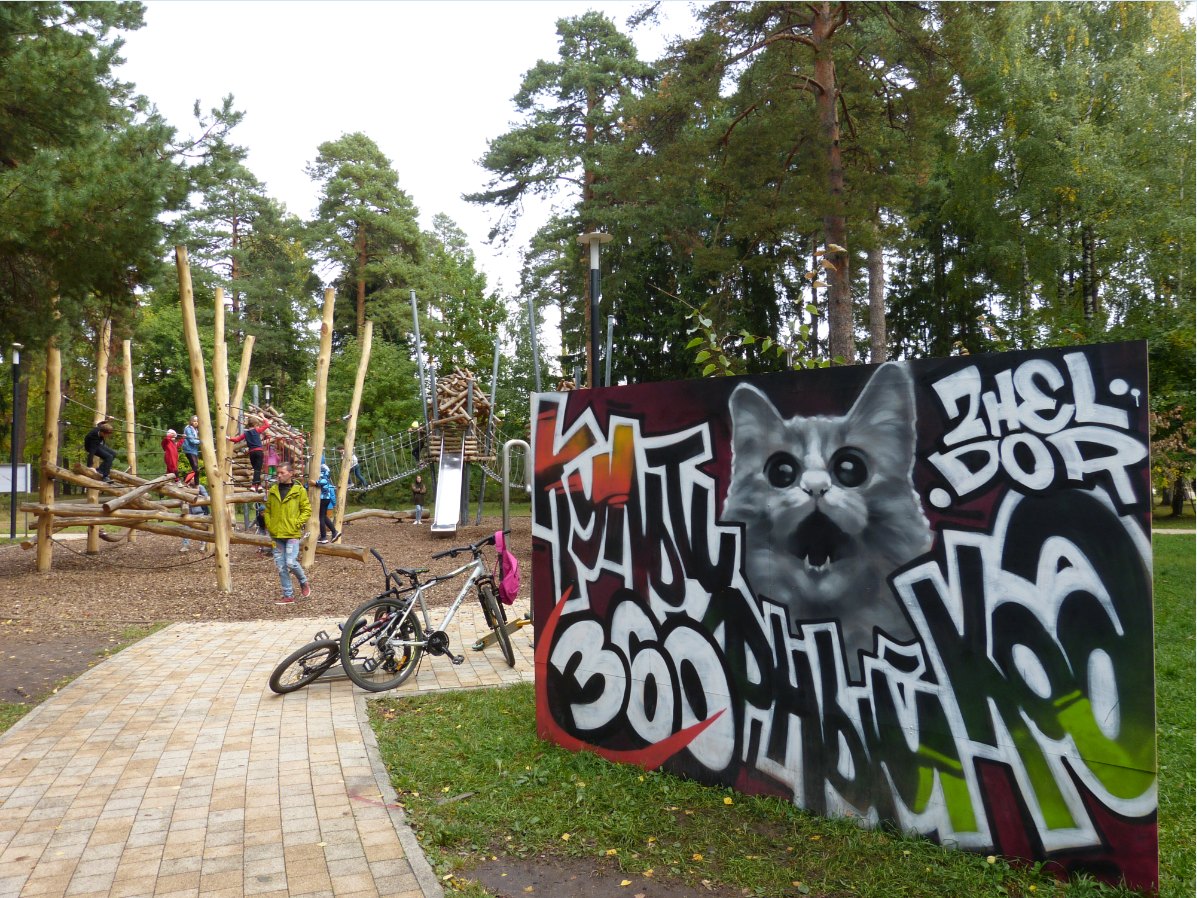 А вот картинка в Пестовском парке. Не знаю, связана ли она с фестивалем стрит-арта, но смотрится забавно, особенно на фоне детской площадки.