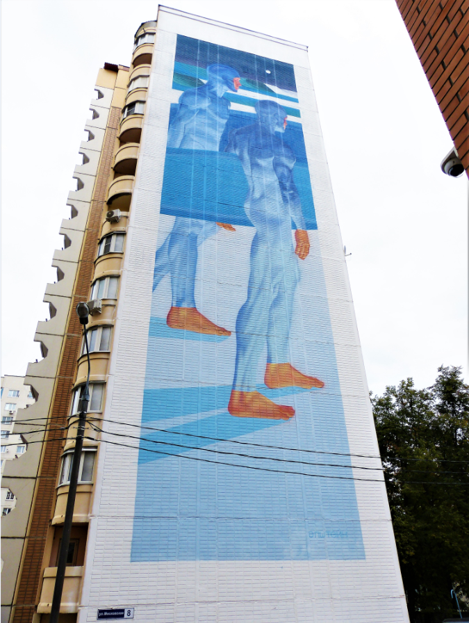 Эта работа заставила вспомнить о художниках-монументалистах типа Давида Сикейроса или Александра Дейнеки.