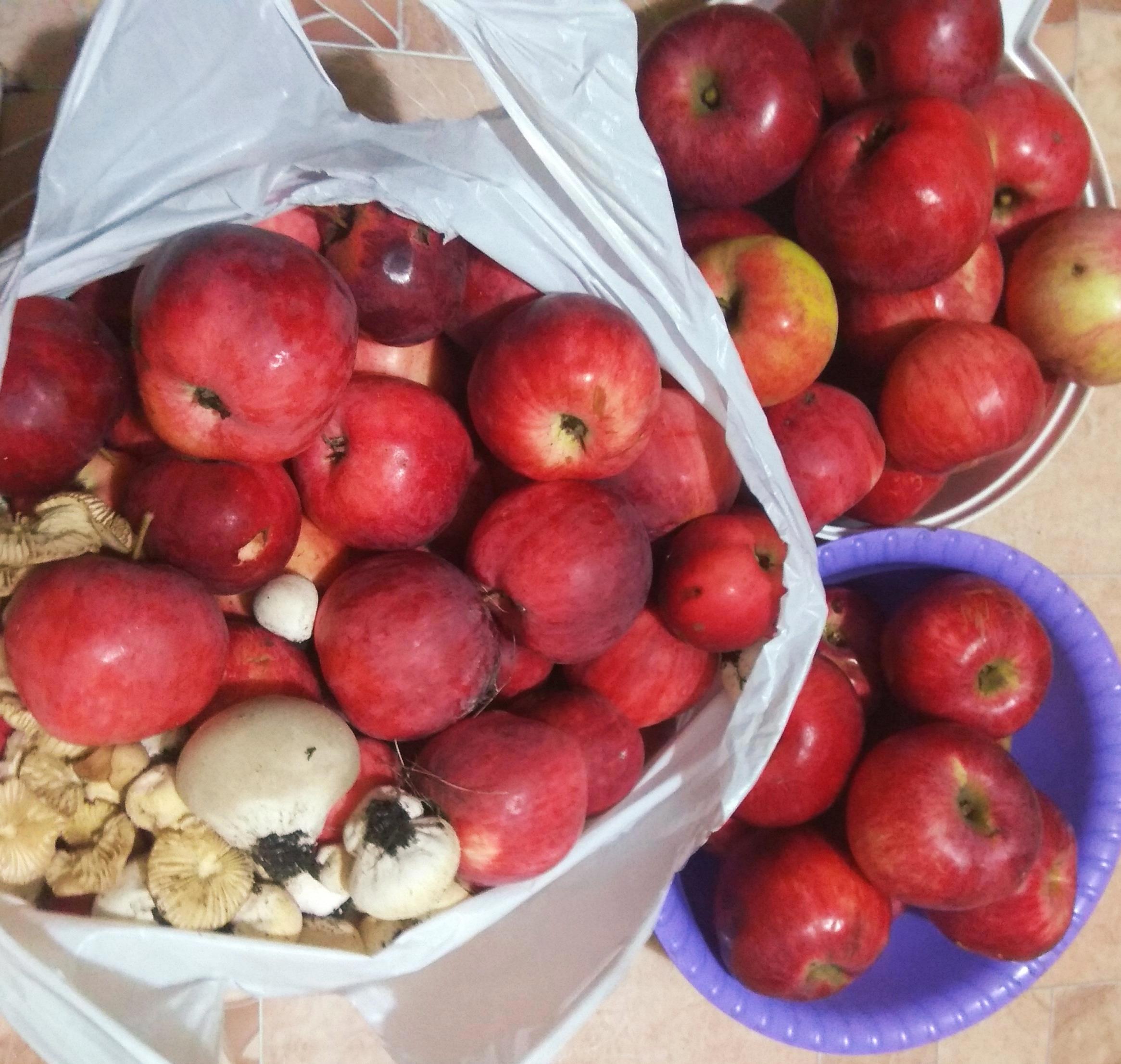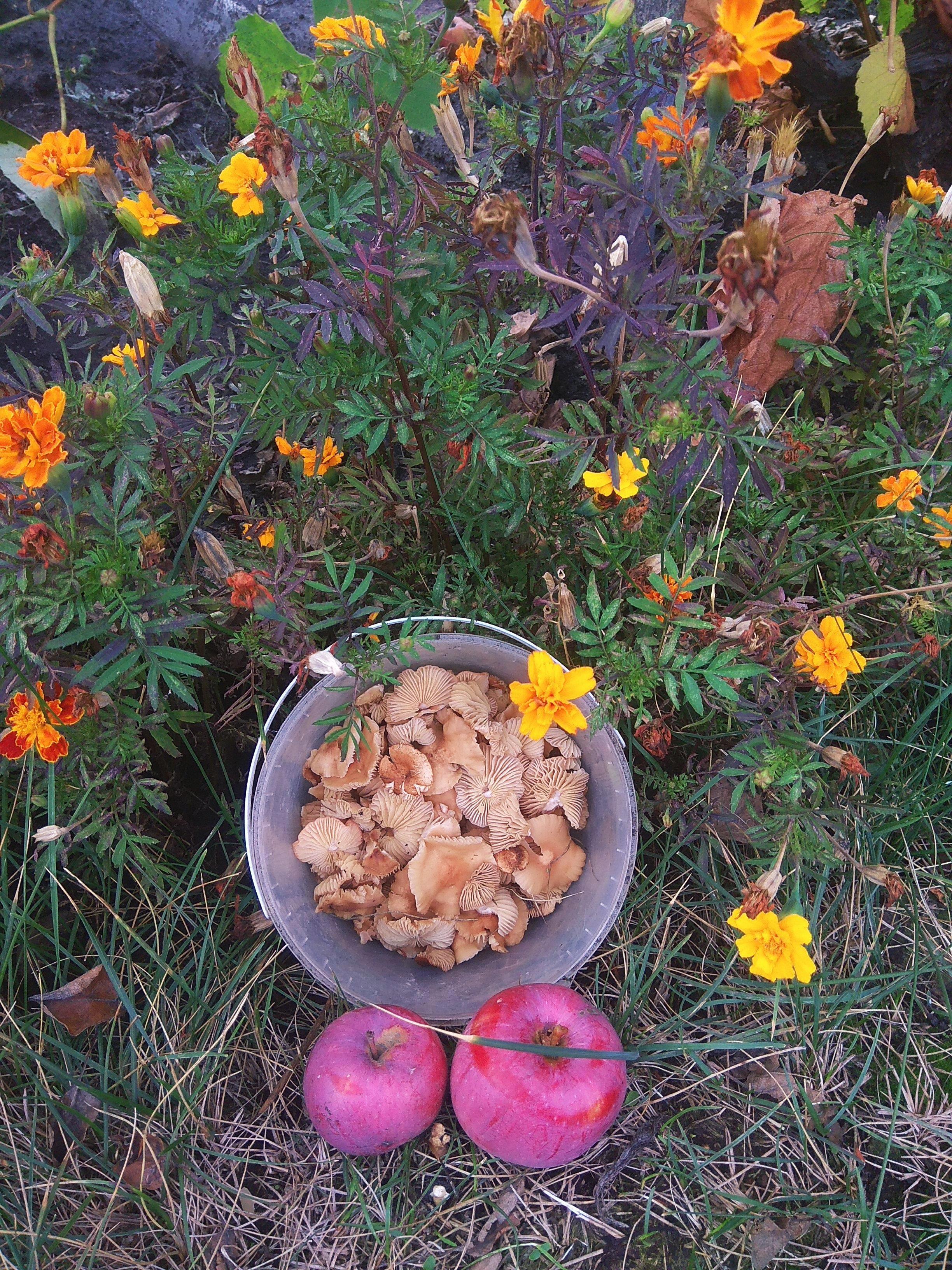 Наткнулась на переспевший анис, (он в пакете), и еще какие-то кисло-сдадкие огромные яблоки. А поскольку меня тут закритиковали по поводу дождевиков, собрала по дороге и их. После дождя этой мелочи завались, хоть одним местом ешь!