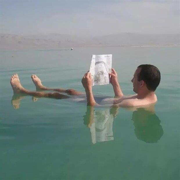 Вода настолько насыщена солью, что люди без усилий могут держаться на её поверхности.